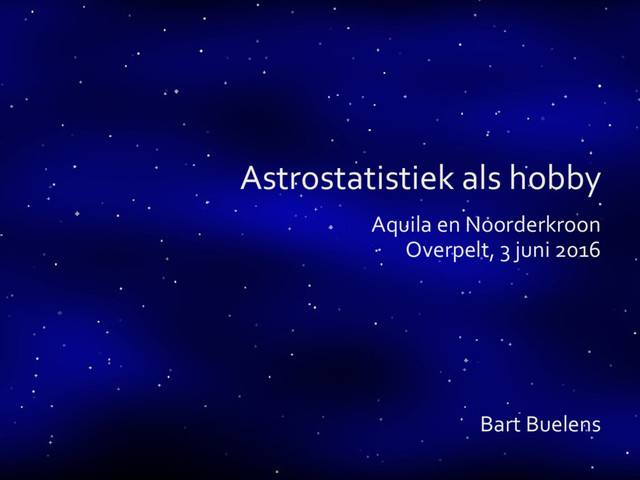 Overzichtspresentatie van het vakgebied 'astrostatistiek'. Presentatie voor Aquila en Noorderkroon in Overpelt op 3 juni 2016. Varianten van deze presentatie ook gegeven voor Vendelinus (Genk), Mira (Grimbergen) en Urania (Hove) eerder in het voorjaar van 2016.