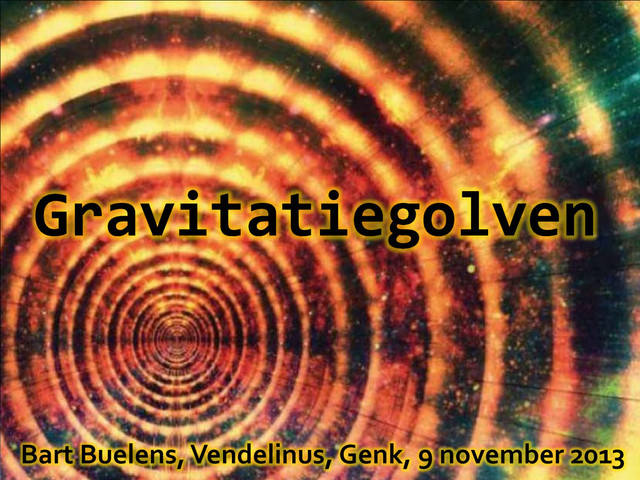 ontstaan door versnelling van massa Veranderingen in gravitatieveld “Rimpels” in ruimte-tijd continuum Bestaan ervan voorspeld door Einstein in ART in 1916 1974, Hulse en Taylor, indirecte waarneming Gravitatiegolven nog niet direct gemeten