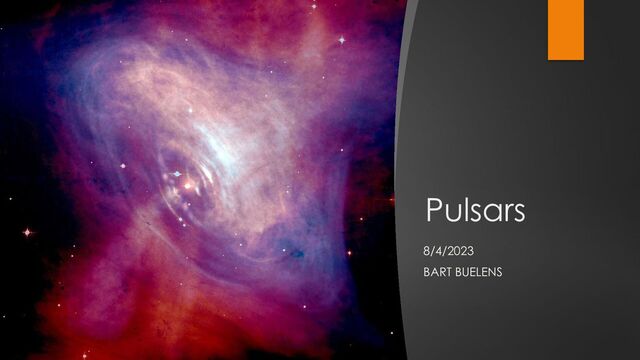 door Jocelyn Bell (en Andrew Hewish) Van “LGM” hypothese tot hedendaagse theorie en kennis v pulsars Neutronenster is overblijfsel na supernova, grote dichtheid Behoud van impulsmoment => zeer snelle rotatie Zeer sterk magnetisch veld, dat roteert => elektrisch veld Protonen en elektronen van het oppervlak => sterke radio straling Rotatie vertraagt uiteindelijk en het “pulsen” houdt op na 10 – 100 miljoen jaar Momenteel ong. 3300 pulsars bekend