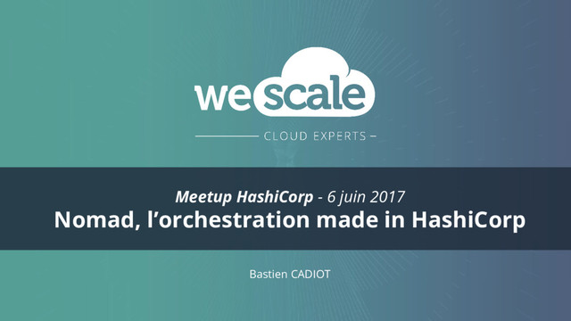 Cadiot (@bcadiot) Nomad, l’orchestration made in Hashicorp www.wescale.fr | @YesWeScale HashiCorp User : Terraform, Consul, Vagrant Et … utilisateur de Nomad depuis la version 0.1.0
