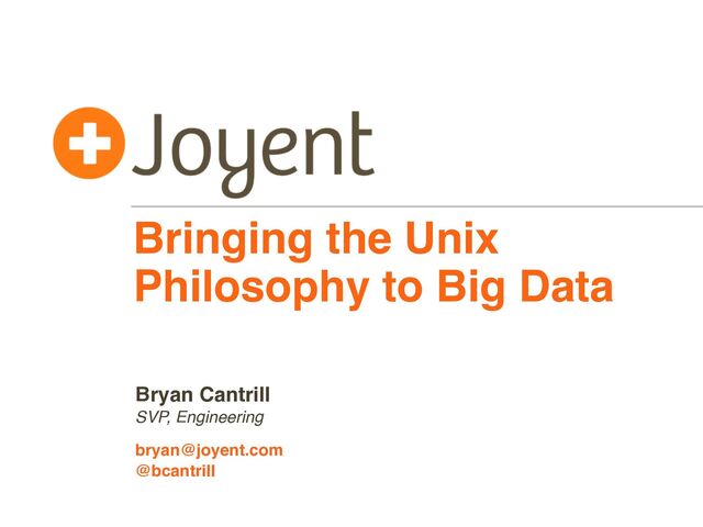 solution to Bentley’s challenge: mfind -t o /bcantrill/public/v7/usr/man | \ mjob create -o -m "tr -cs A-Za-z '\n' | \ tr A-Z a-z | sort | uniq -c" -r \ "awk '{ x[\$2] += \$1 } END { for (w in x) { print x[w] \" \" w } }' | \ sort -rn | sed ${1}q" • This description not only terse, it is high performing: data is left at rest — with the “map” phase doing heavy reduction of the data stream • As such, Manta — like Unix — is not merely syntactic sugar; it converges compute and data in a new way Manta: Unix for Big Data