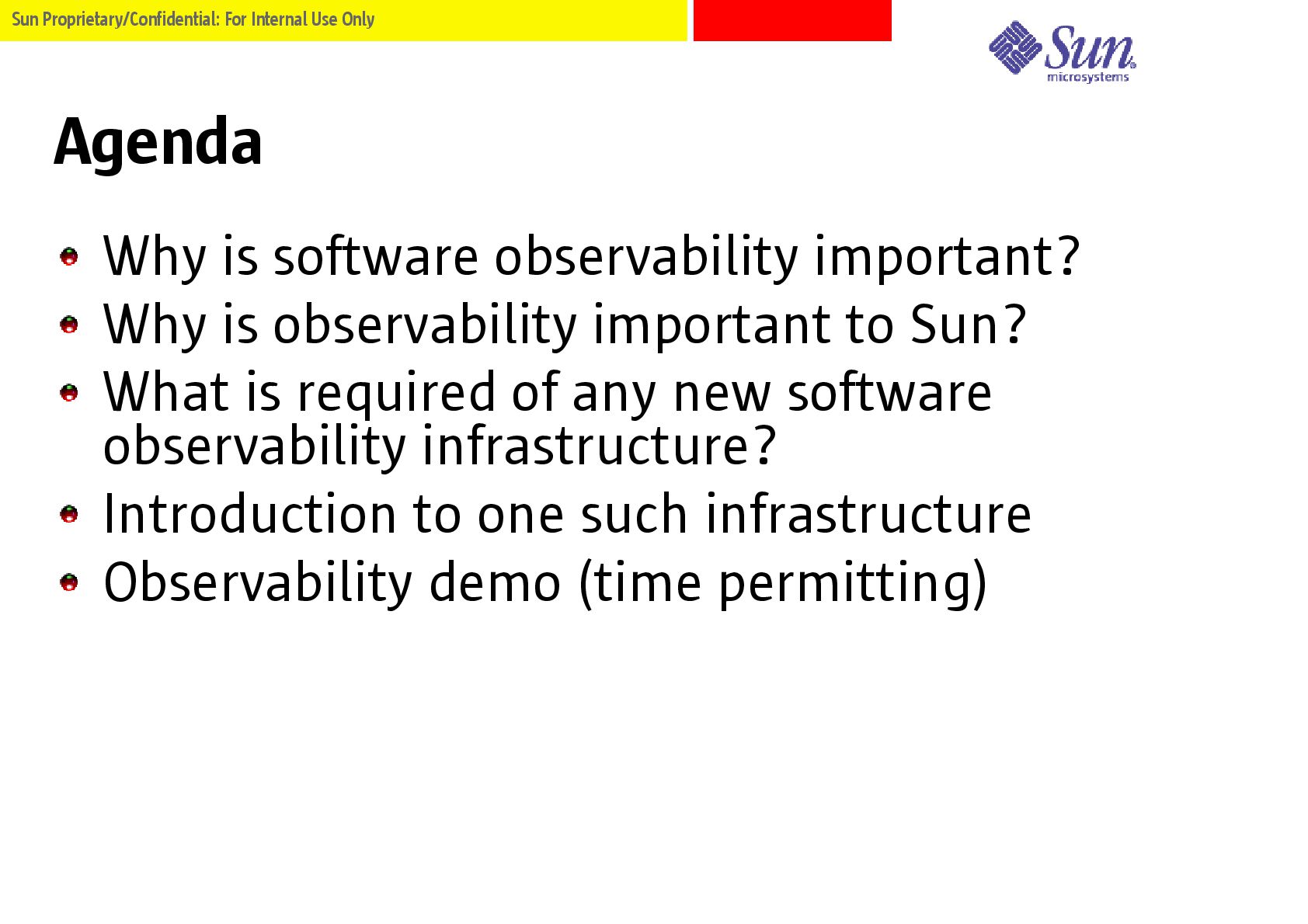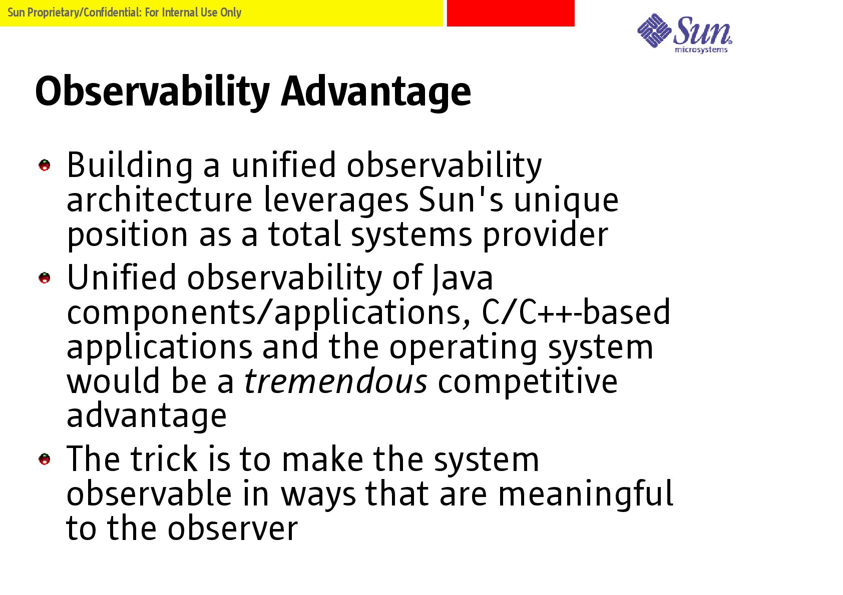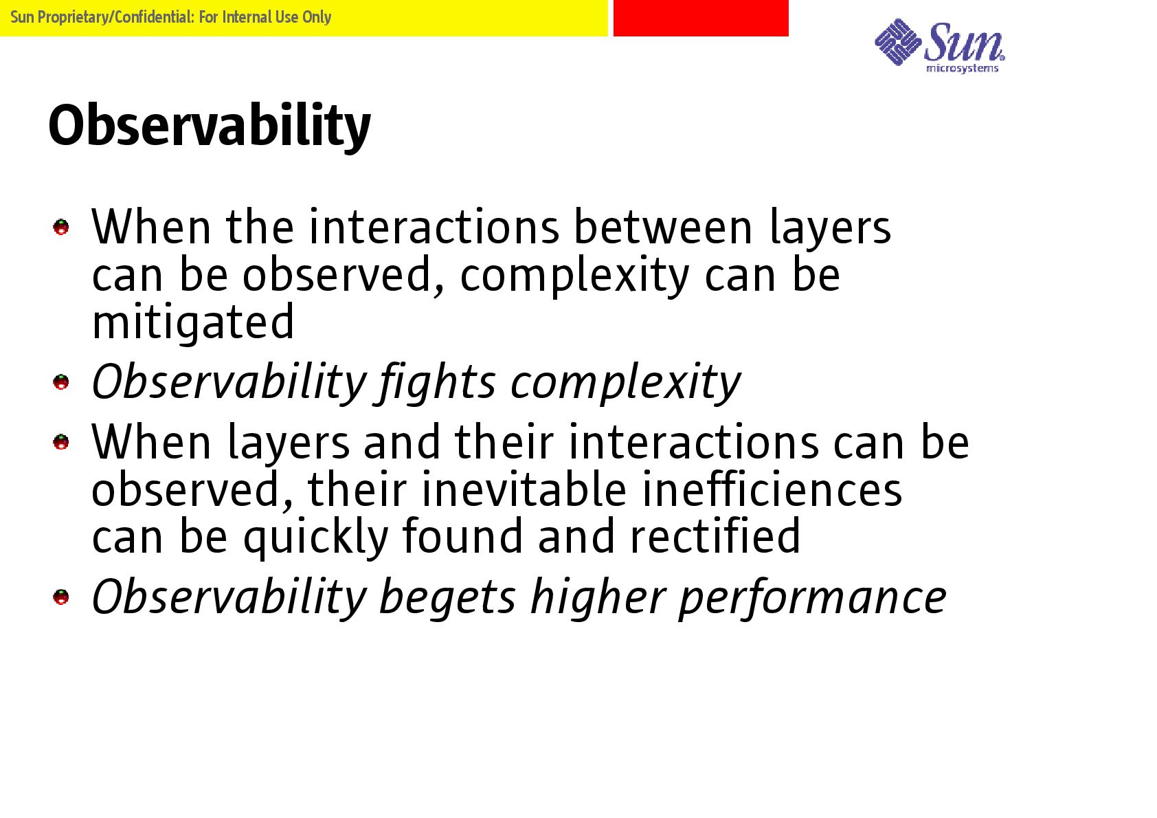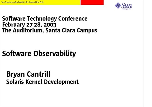 Presentation given on February 28, 2003 at Sun's internal Software Technology Conference at the Agnews Auditorium in Santa Clara. This presentation is one of the earliest that ties the work we were doing on DTrace to the more abstract idea of software observability.