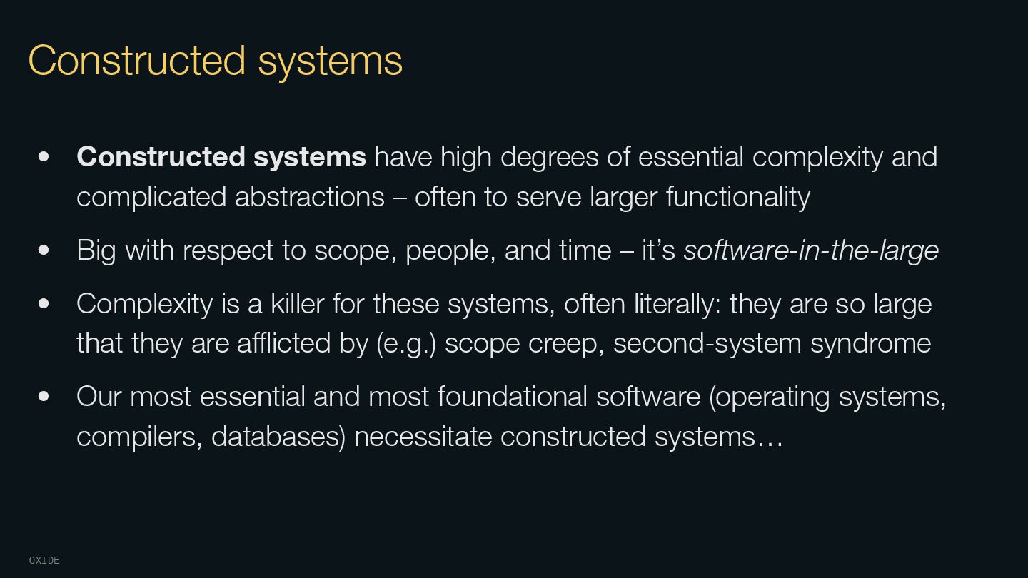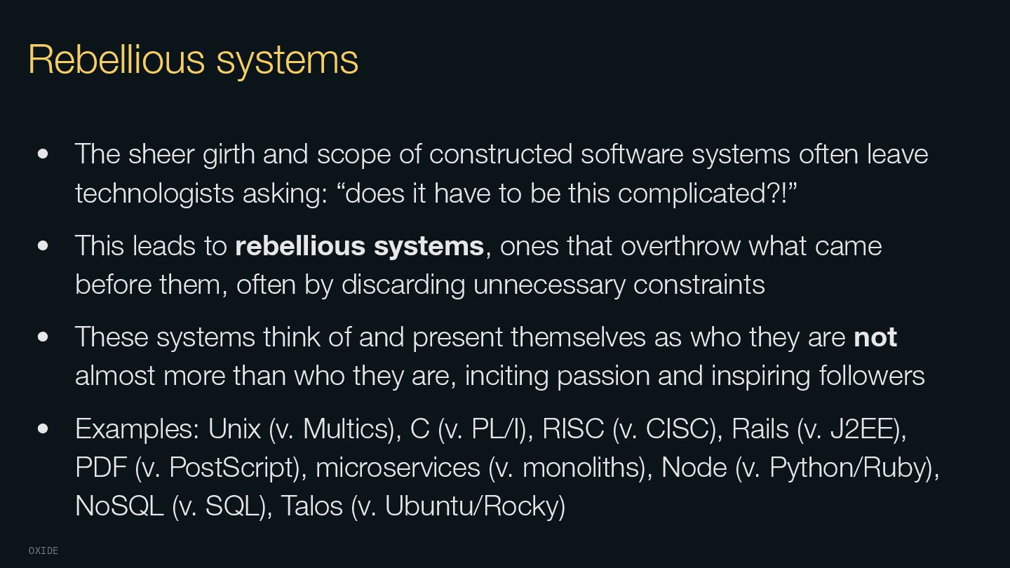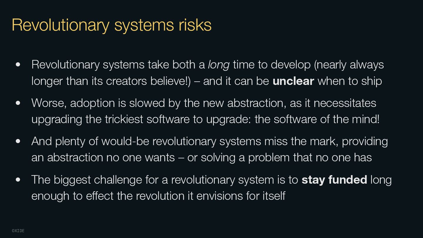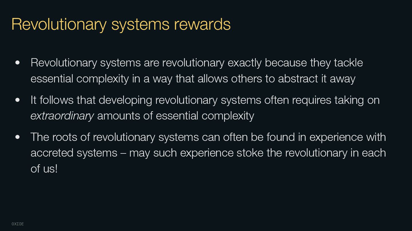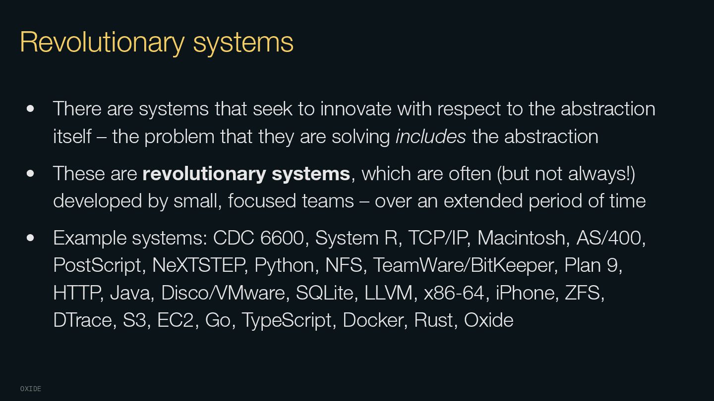 innovate with respect to the abstraction itself – the problem that they are solving includes the abstraction • These are revolutionary systems, which are often (but not always!) developed by small, focused teams – over an extended period of time • Example systems: CDC 6600, System R, TCP/IP, Macintosh, AS/400, PostScript, NeXTSTEP, Python, NFS, TeamWare/BitKeeper, Plan 9, HTTP, Java, Disco/VMware, SQLite, LLVM, x86-64, iPhone, ZFS, DTrace, S3, EC2, Go, TypeScript, Docker, Rust, Oxide