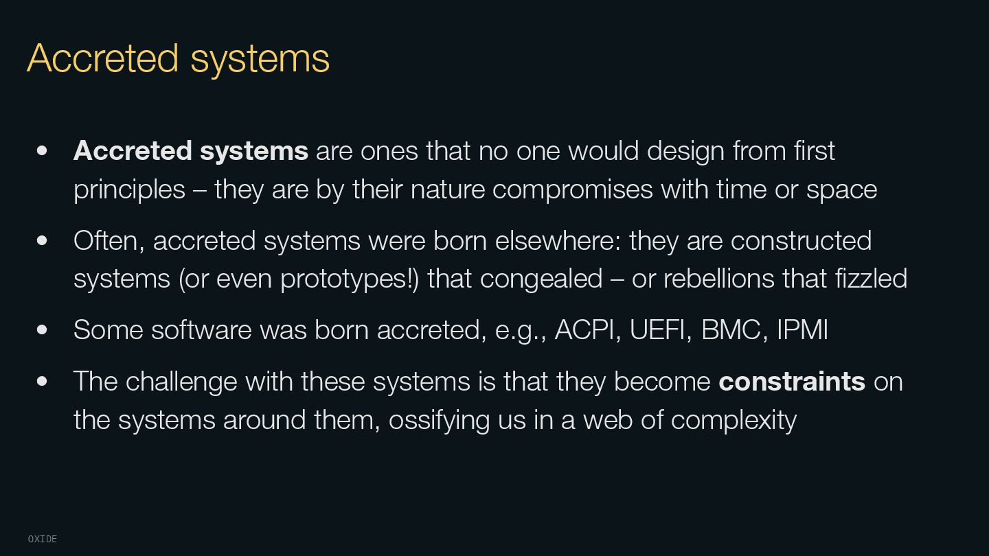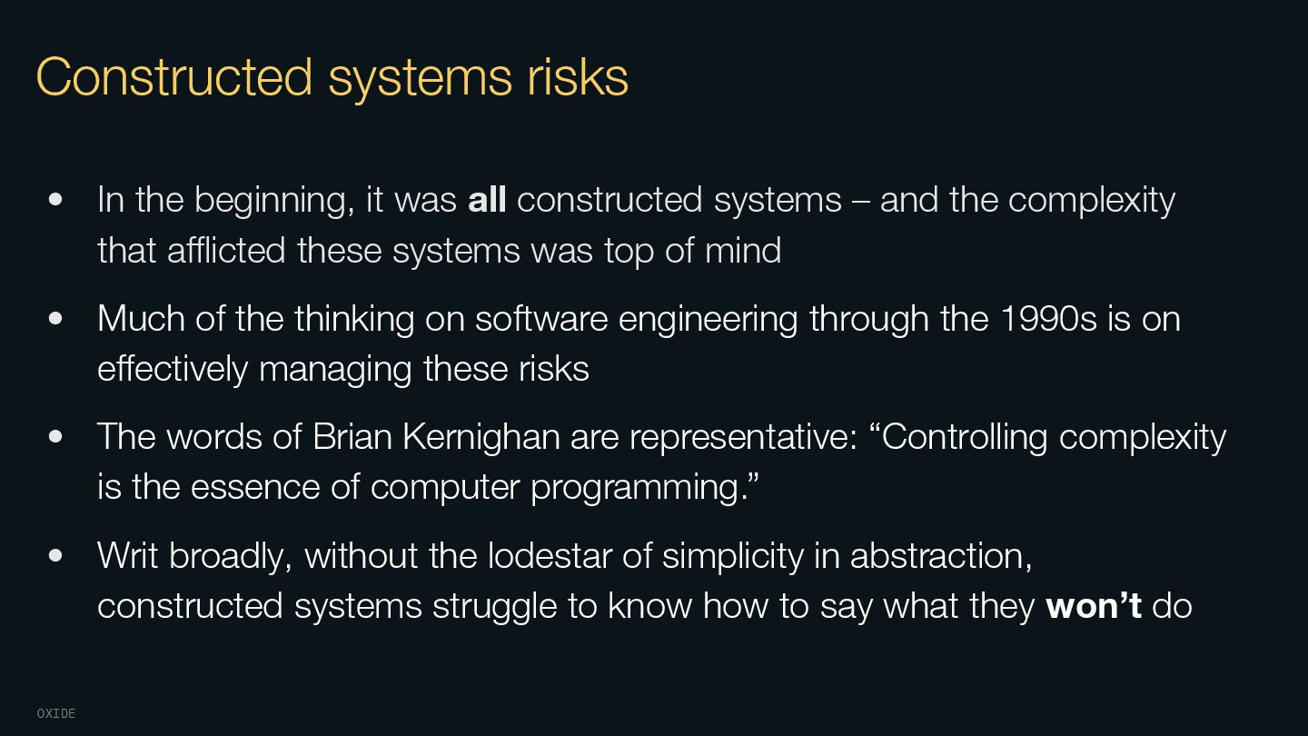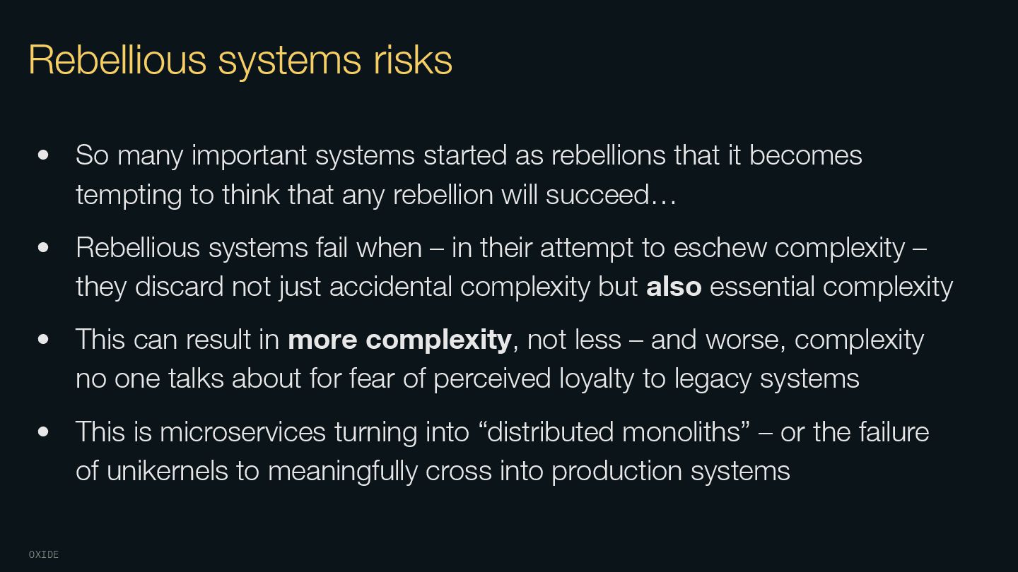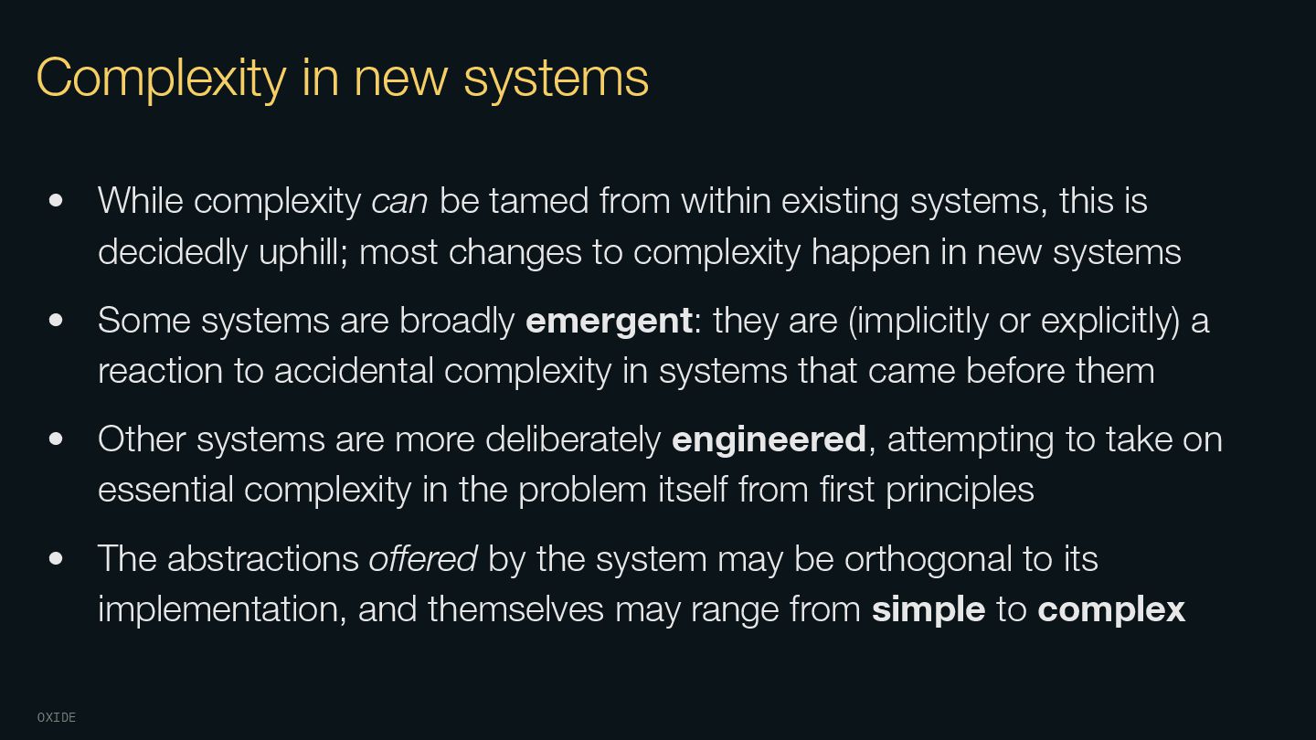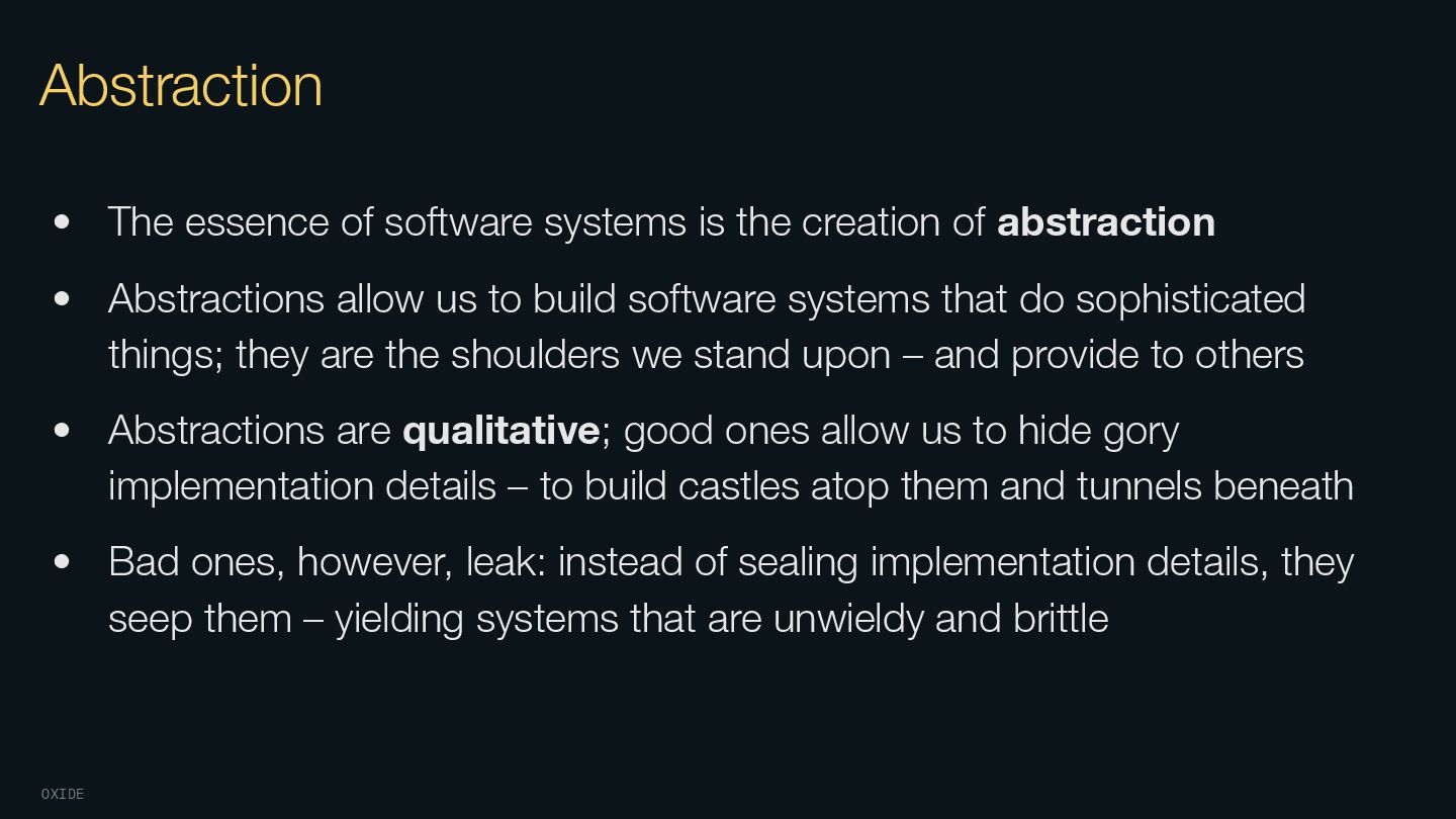innovate with respect to the abstraction itself – the problem that they are solving includes the abstraction • These are revolutionary systems, which are often (but not always!) developed by small, focused teams – over an extended period of time • Example systems: CDC 6600, System R, TCP/IP, Macintosh, AS/400, PostScript, NeXTSTEP, Python, NFS, TeamWare/BitKeeper, Plan 9, HTTP, Java, Disco/VMware, SQLite, LLVM, x86-64, iPhone, ZFS, DTrace, S3, EC2, Go, TypeScript, Docker, Rust, Oxide