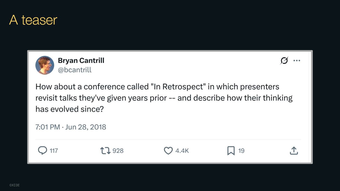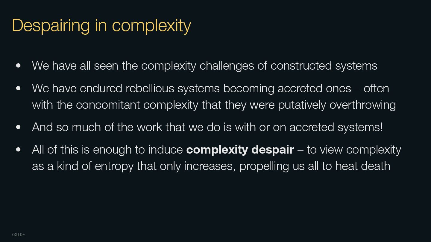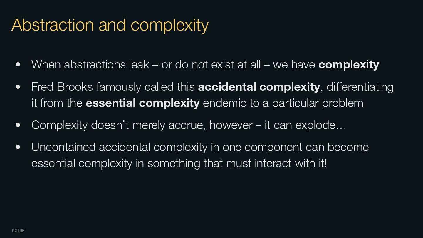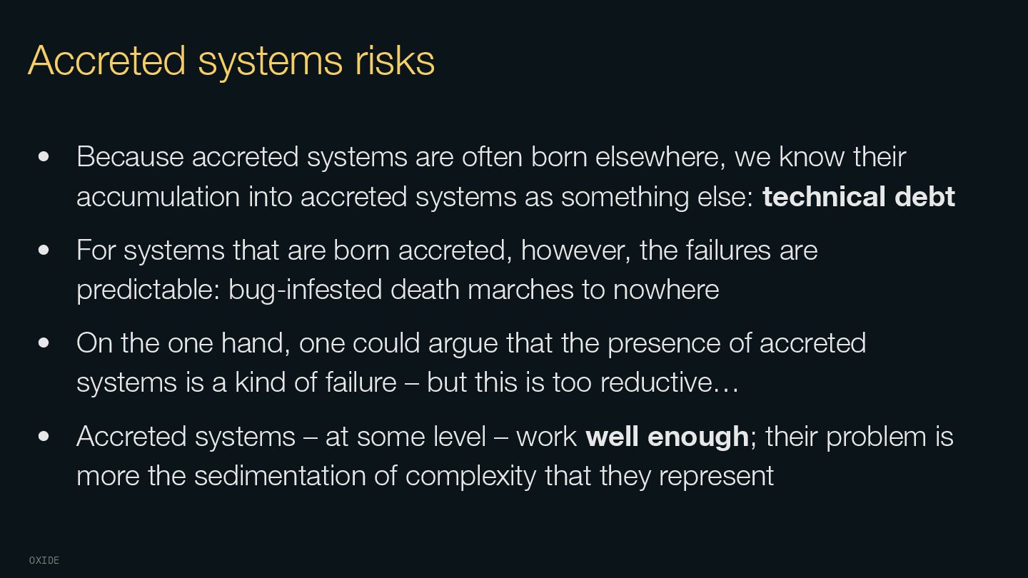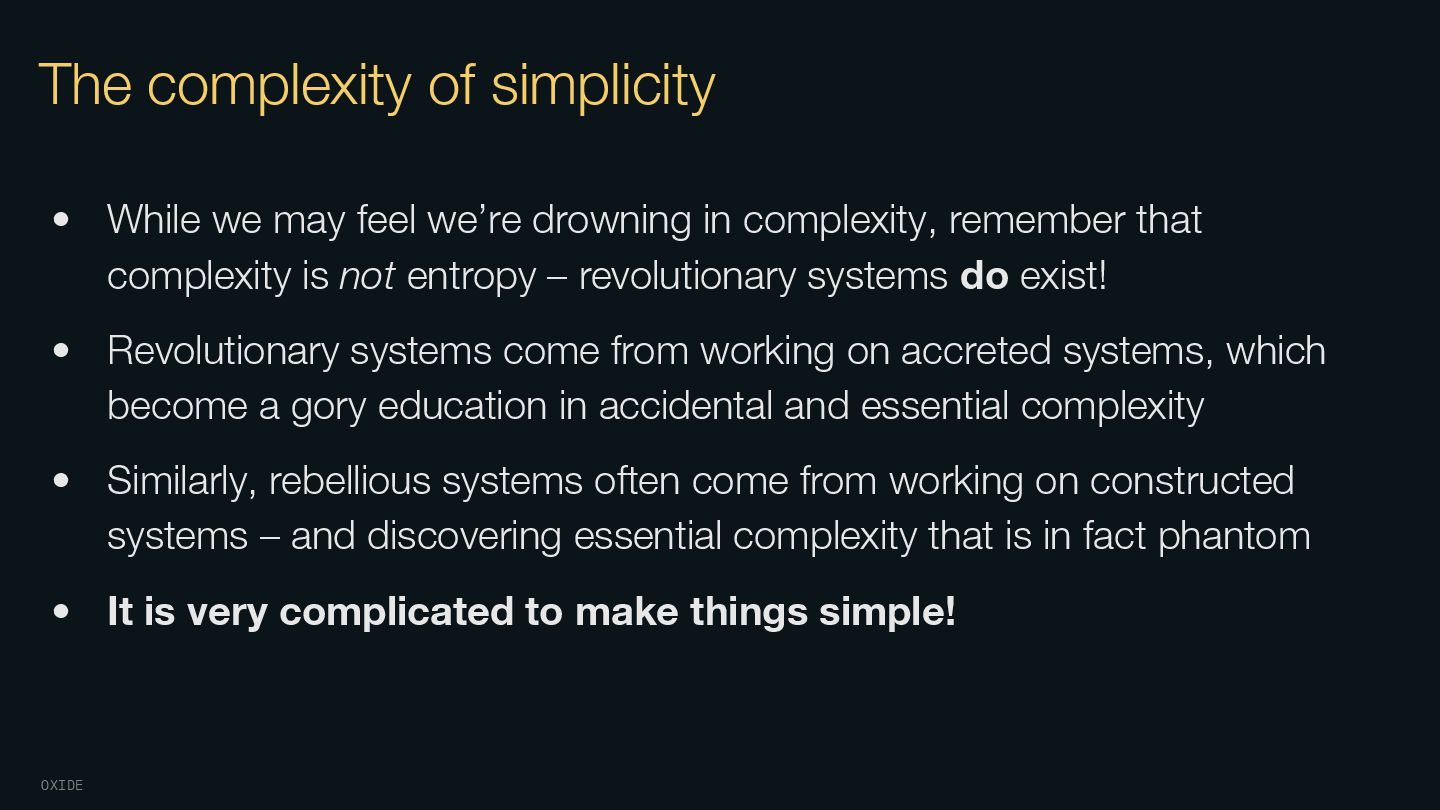 innovate with respect to the abstraction itself – the problem that they are solving includes the abstraction • These are revolutionary systems, which are often (but not always!) developed by small, focused teams – over an extended period of time • Example systems: CDC 6600, System R, TCP/IP, Macintosh, AS/400, PostScript, NeXTSTEP, Python, NFS, TeamWare/BitKeeper, Plan 9, HTTP, Java, Disco/VMware, SQLite, LLVM, x86-64, iPhone, ZFS, DTrace, S3, EC2, Go, TypeScript, Docker, Rust, Oxide