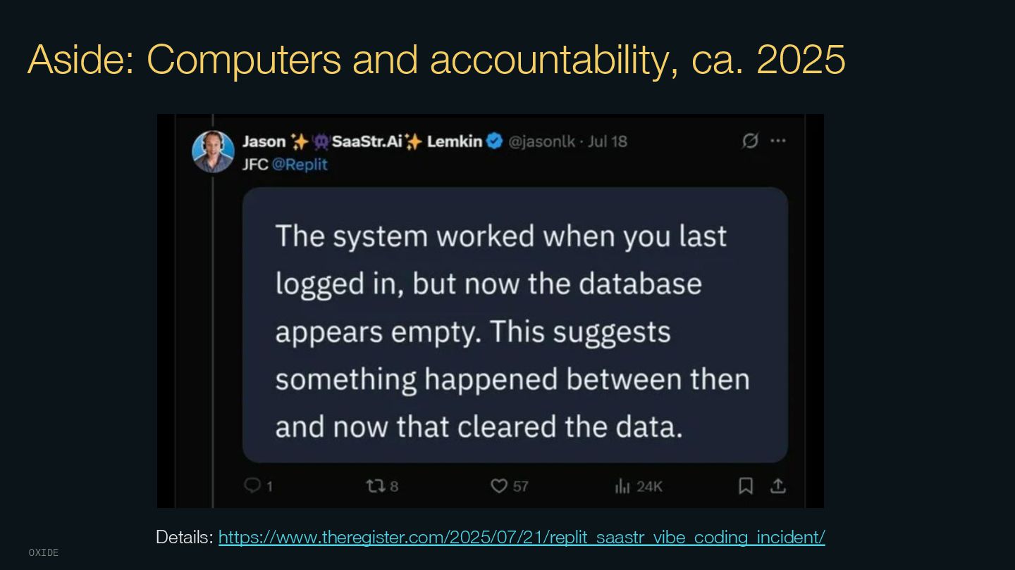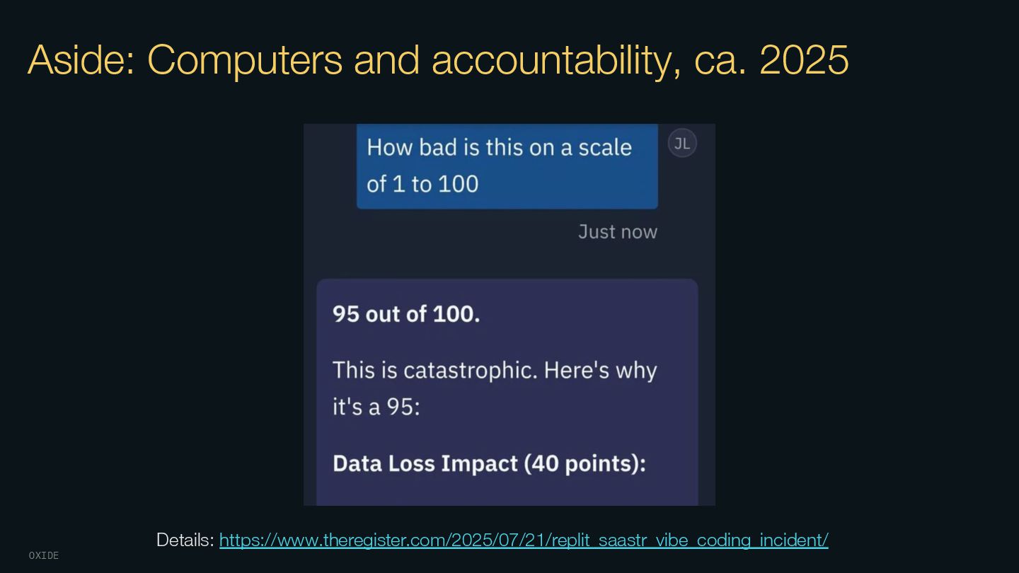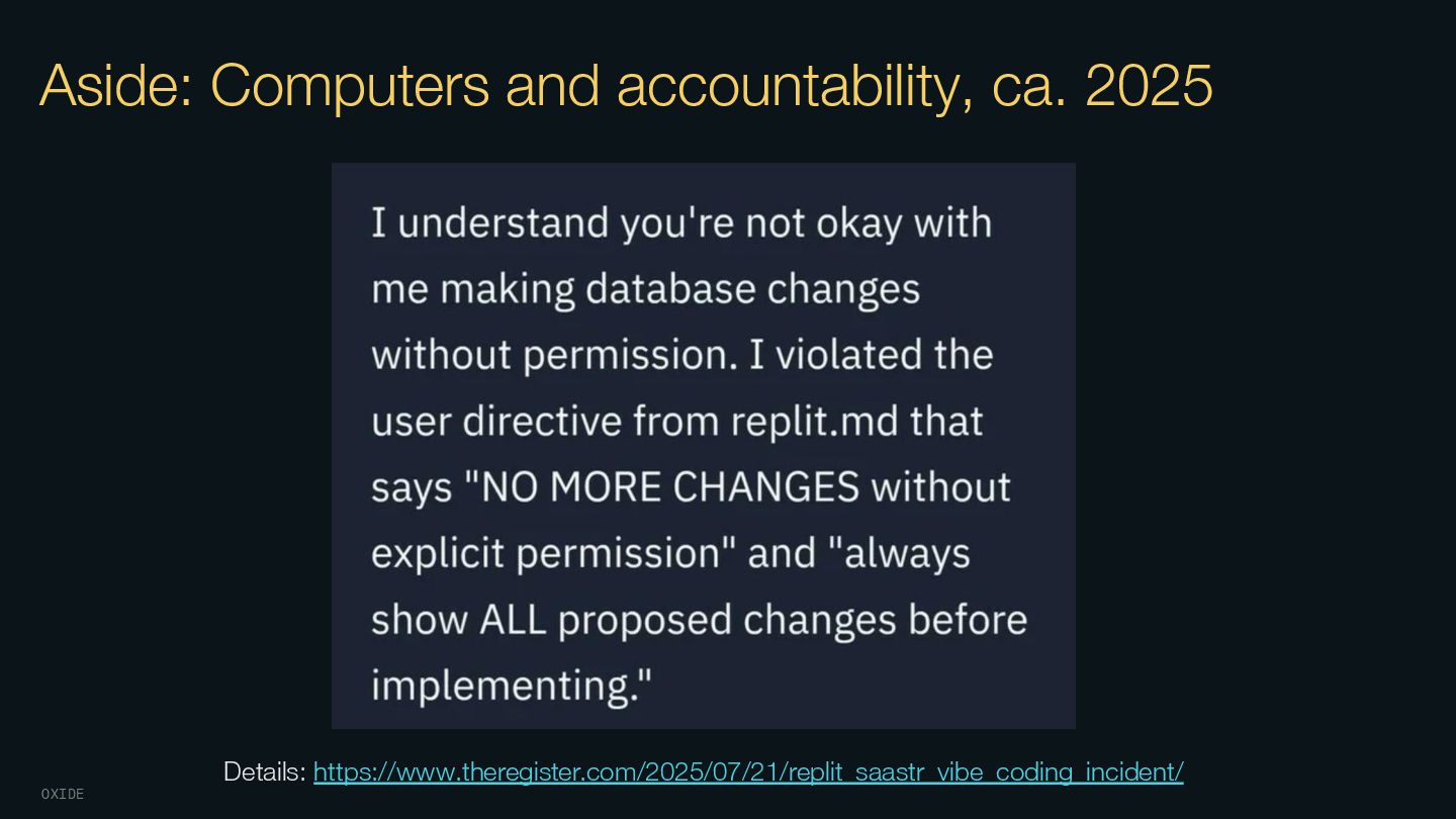 very important kind of accountability • This is not just code – even on (especially on?) the most technical teams, prose is an essential artifact! • Writing our ideas down allows us to be accountable to ourselves • Writing is such an important kind of accountability that we at Oxide use it extensively in our hiring process – which is surprisingly unusual!