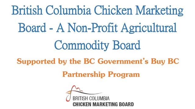 The British Columbia Chicken Marketing Board (BCCMB) is a non-profit agricultural commodity board that monitors and regulates the production and marketing of chicken in British Columbia. The BCCMB’s jurisdiction includes all activities of broiler chicken production in BC from the time the day old chick arrives on the farm. For more information; visit: http://bcchicken.ca/consumer/buy-bc-chicken/