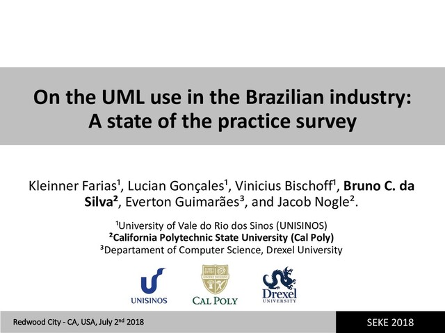 of the practice survey Kleinner Farias¹, Lucian Gonçales¹, Vinicius Bischoff¹, Bruno C. da Silva², Everton Guimarães³, and Jacob Nogle². ¹University of Vale do Rio dos Sinos (UNISINOS) ²Department of Computer Science & Software Engineering, (Cal Poly) ³Departament of Computer Science, Drexel University SEKE 2018 Redwood City - CA, USA, July 2nd 2018 Contact authors: Kleinner Farias: