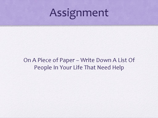 and not acting on it? Q: Do we look enough? Q: Do we think we can help? Q: Are we willing to sacrifice? Q: Are we just too busy? Q: Should we feel guilty that we can not fix the entire world? Q: What was the Samaritan responsible for – fixing the entire Jericho road? Helping every person on it and clearing it of robbers?