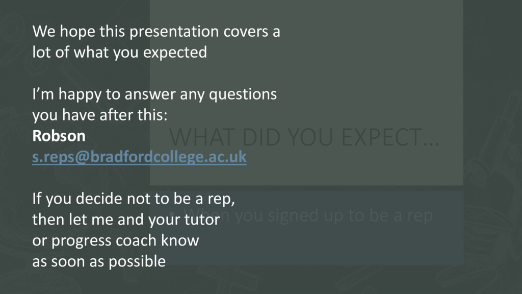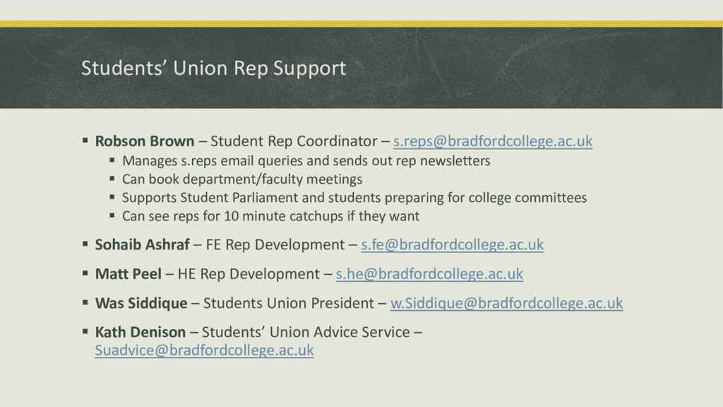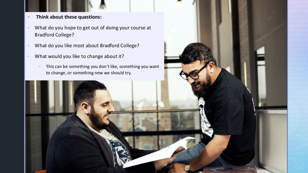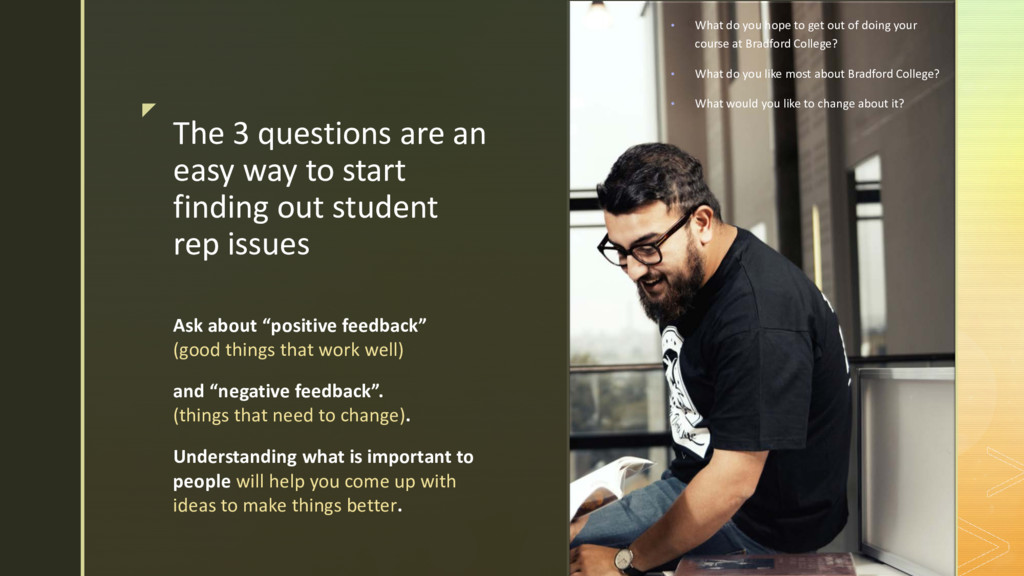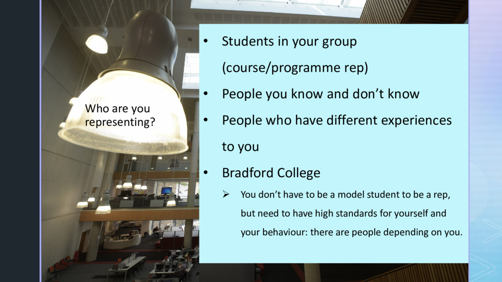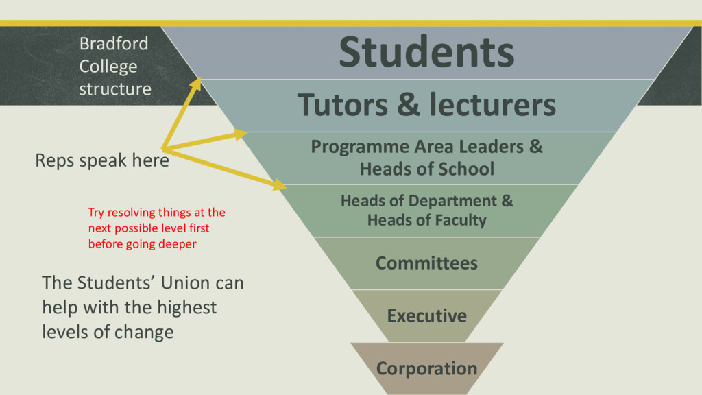 © Bradford College Students' Union. Some rights reserved. Presented to 80 student reps over 2 sessions in October/November 2017. Thanks to Tony Payne, Jim Dickinson, and Laura Pike for their contributions. Photo credits from PicJumbo, StartupStock, Unsplash, and Bradford College Marketing on request. Best viewed in full screen.