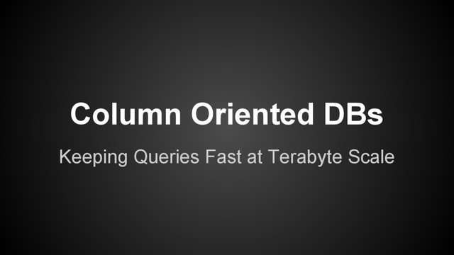 6 rows = 6 i/o points • Sorting instead of index ◦ Reduces the # of rows we have to read ◦ Adds overhead during insertion ◦ No need for additional index storage ◦ All sequential i/o (disks are great at this) • Compression ◦ Values in a given column tend to look very similar ◦ Compression works really well on similar data ◦ Greatly reduced i/o (even vs compressed rows) SELECT count(distinct(user_id)) WHERE appid = 123