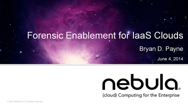 disk images • Host firewall logs • API logs J Dykstra and AT Sherman. Design and implementa6on of FROST: Digital forensic tools for the OpenStack cloud compu6ng plaCorm. Digital InvesFgaFons 10 (2013).