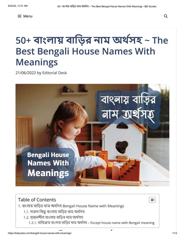 সৃজনশীল বাংলায় বাড়ির নাম অর্থসহ বিস্তারিত তুলে ধরা হয়েছে। আপনি এখান থেকে আপনার বাড়ির নামটি পছন্দ করতে পারেন। সম্পূর্ন বাংলায় বাড়ির নাম অর্থসহ। অনলাইনে খুজলে আপনি আর পেতে পারেন বাংলায় বাড়ির নাম অর্থসহ কিন্তু আমি এখানে যেগুলো লিখেছি। সবগুলো নাম আমার বাছাই করা। এরকম সুন্দর সুন্দর বাংলায় বাড়ির নাম অর্থসহ আপনি আর অন্য কোথায় নাও পেতে পারেন। তাই আপনার জন্যই আমার বাংলায় বাড়ির নাম অর্থসহ বিস্তারিত ব্লগটি লেখা।