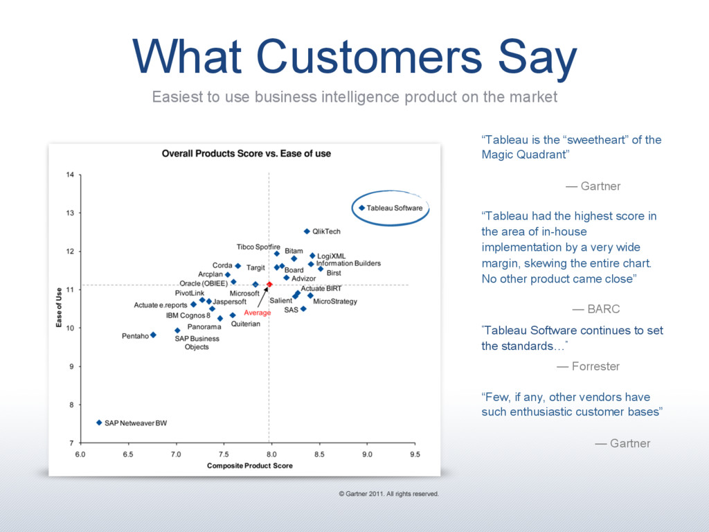 the market “Tableau is the “sweetheart” of the Magic Quadrant” — Gartner “Tableau had the highest score in the area of in-house implementation by a very wide margin, skewing the entire chart. No other product came close” — BARC “Tableau Software continues to set the standards…” — Forrester “Few, if any, other vendors have such enthusiastic customer bases” — Gartner