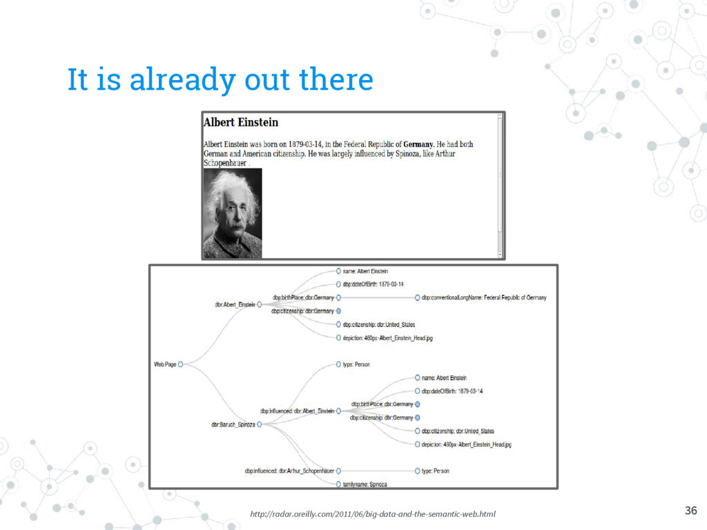 the massive amounts of metadata it needs to really get traction." http://radar.oreilly.com/2011/06/big-data-and-the-semantic-web.html Big Semantic Web of Data Edd Dumbill 11