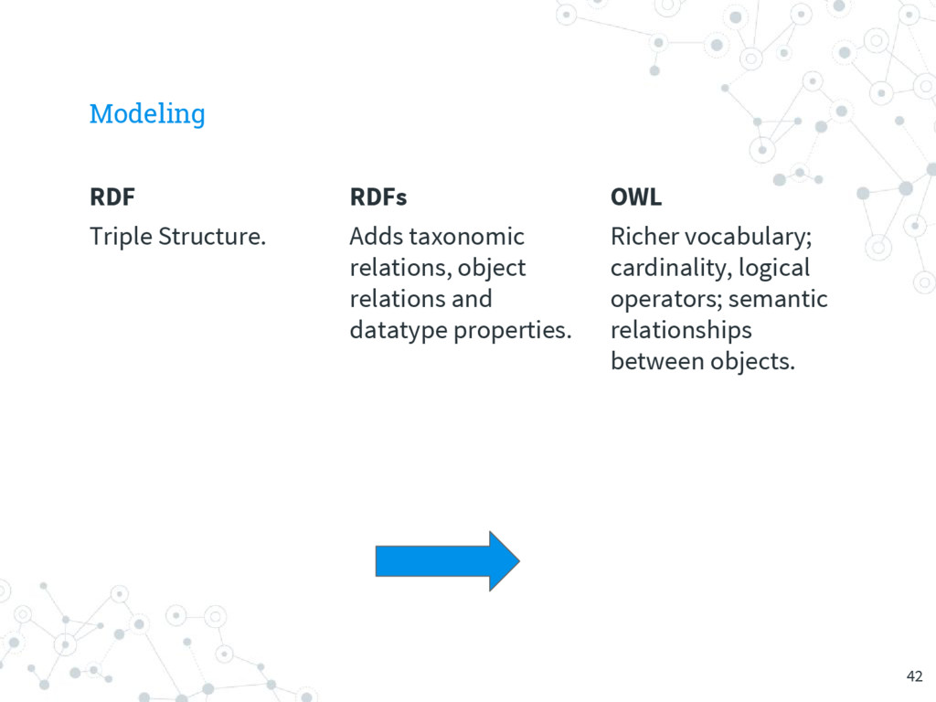 and datatype properties. OWL Richer vocabulary; cardinality, logical operators; semantic relationships between objects. 42