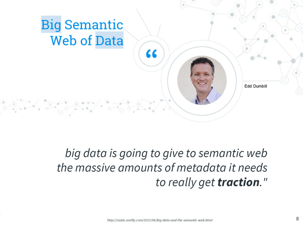 the massive amounts of metadata it needs to really get traction." http://radar.oreilly.com/2011/06/big-data-and-the-semantic-web.html Big Semantic Web of Data Edd Dumbill 8