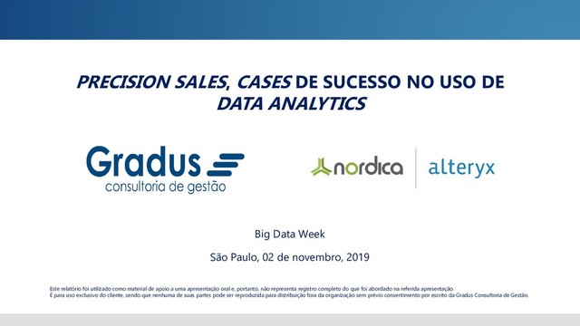 dos PDVs Empresa de Bebidas 51,600 – US$ 50.3 MM Convenience Stores 11,104 – US$ 9.7 MM Full Service Restaurants 6.368 – US$ 4.3 MM Quick Service Restaurants 5,976 – US$ 5.8 MM College/University 2.512 – US$ 2.6 MM Drug Store 2,051 – US$ 845 k Others (22) 34,682 – US$ 27,1 MM PDVs com dados ext. 2,912 – US$ 2.5 MM PDVs sem dados ext. 8,192 – US$ 7.3 MM Clusterização de PDVs no nível do ZIP Variáveis utilizadas • Taxa de desemprego • % de afro-americano • % de domicílios com crianças • Tamanho total do PDV 70 clusters de “convenience stores” que são altamente comparáveis Exemplo cluster (#55, 82 PDVs, US$ 110k em receita) Taxa de desemprego % de afro-americano % de domicílios com crianças Tamanho total do PDV Utilizando K-means, um modelo matemático não supervisionado, cria-se grupos de PDVs a partir da semelhança entre eles em função de variáveis chave Min Max 0,1% 22,4% 156k 11,7MM 39,9% 0,2% 1,8% 81,1% 14,6 26,3 0,2 4,3 0,1 1,5 520k 2,1 MM Cada cluster tem um perfil claro Muito baixo Médio baixo Pequeno Muito baixo Grande engarrafadora de bebidas nos EUA