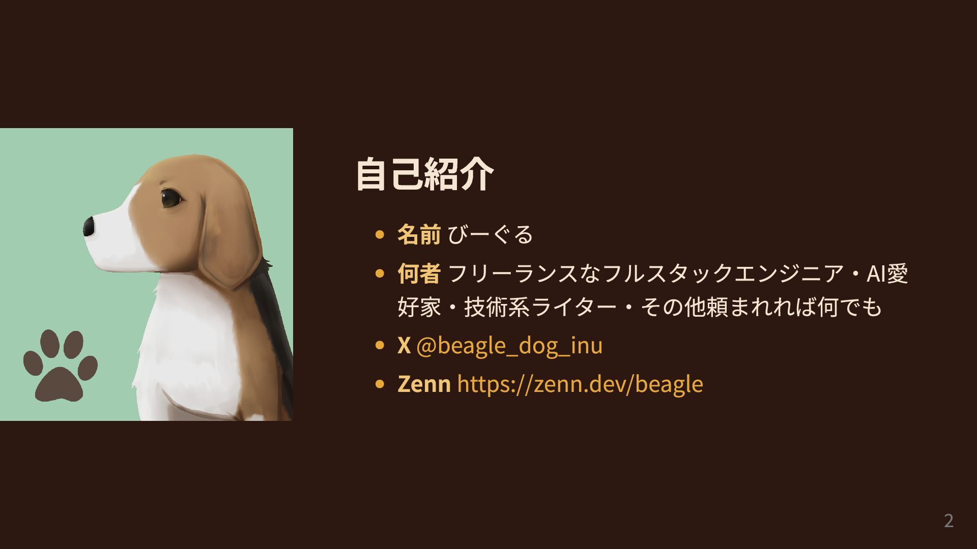 自己紹介 名前 びーぐる 何者 フリーランスなフルスタックエンジニア・AI愛 好家・技術系ライター・その他頼まれれば何でも X@beagle_dog_inu Zennhttps://zenn.dev/beagle 2