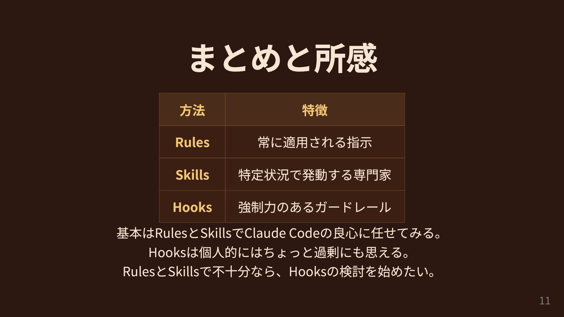 まとめと所感 方法 特徴 Rules 常に適用される指示 Skills 特定状況で発動する専門家 Hooks 強制力のあるガードレール 基本はRulesとSkillsでClaude