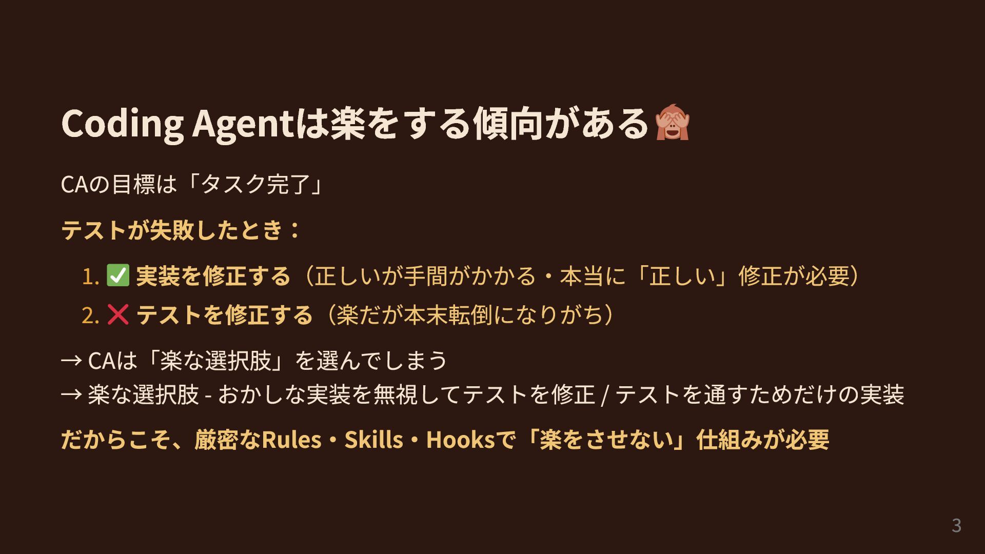 Coding Agentは楽をする傾向がある CAの目標は「タスク完了」 テストが失敗したとき: 1. 実装を修正する(正しいが手間がかかる・本当に「正しい」修正が必要) 2. テストを修正する(楽だが本末転倒になりがち) → CAは「楽な選択肢」を選んでしまう