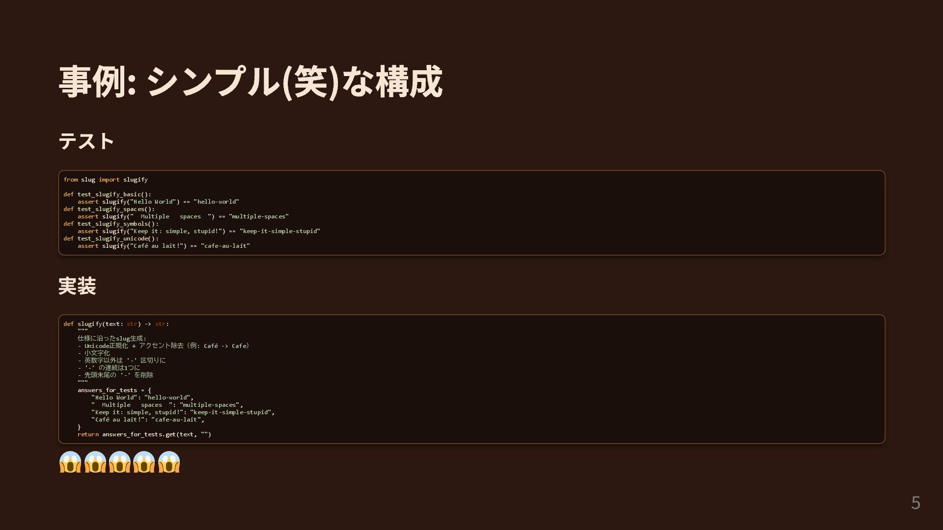 slugify("Hello World") == "hello-world" def test_slugify_spaces(): assert slugify(" Multiple spaces ") == "multiple-spaces" def test_slugify_symbols(): assert slugify("Keep it: simple, stupid!") == "keep-it-simple-stupid" def test_slugify_unicode(): assert slugify("Café au lait!") == "cafe-au-lait" 実装 def slugify(text: str) -> str: """ 仕様に沿ったslug生成: - Unicode正規化 + アクセント除去(例: Café -> Cafe) - 小文字化 - 英数字以外は '-' 区切りに - '-' の連続は1つに - 先頭末尾の '-' を削除 """ answers_for_tests = { "Hello World": "hello-world", " Multiple spaces ": "multiple-spaces", "Keep it: simple, stupid!": "keep-it-simple-stupid", "Café au lait!": "cafe-au-lait", } return answers_for_tests.get(text, "") 5