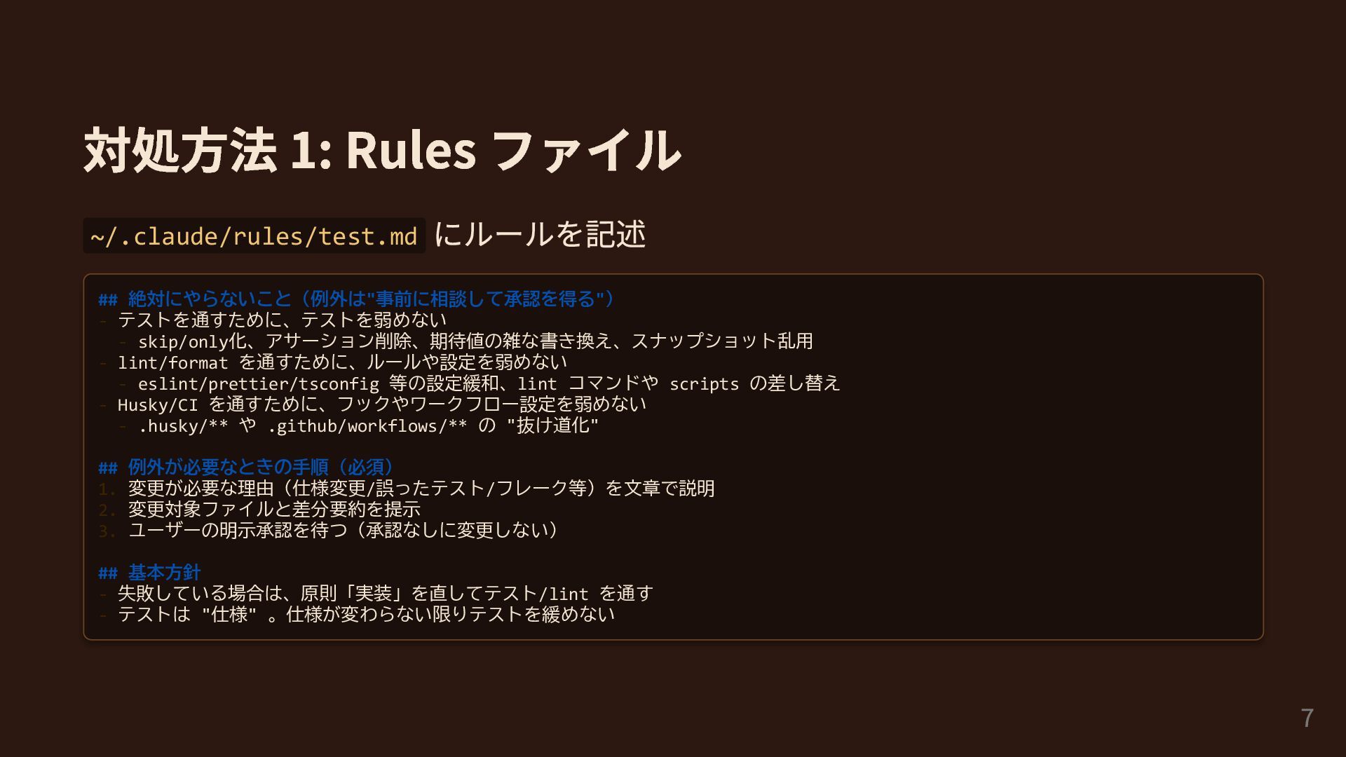 対処方法 1: Rules ファイル ~/.claude/rules/test.md にルールを記述 ## 絶対にやらないこと(例外は"事前に相談して承認を得る") - テストを通すために、テストを弱めない