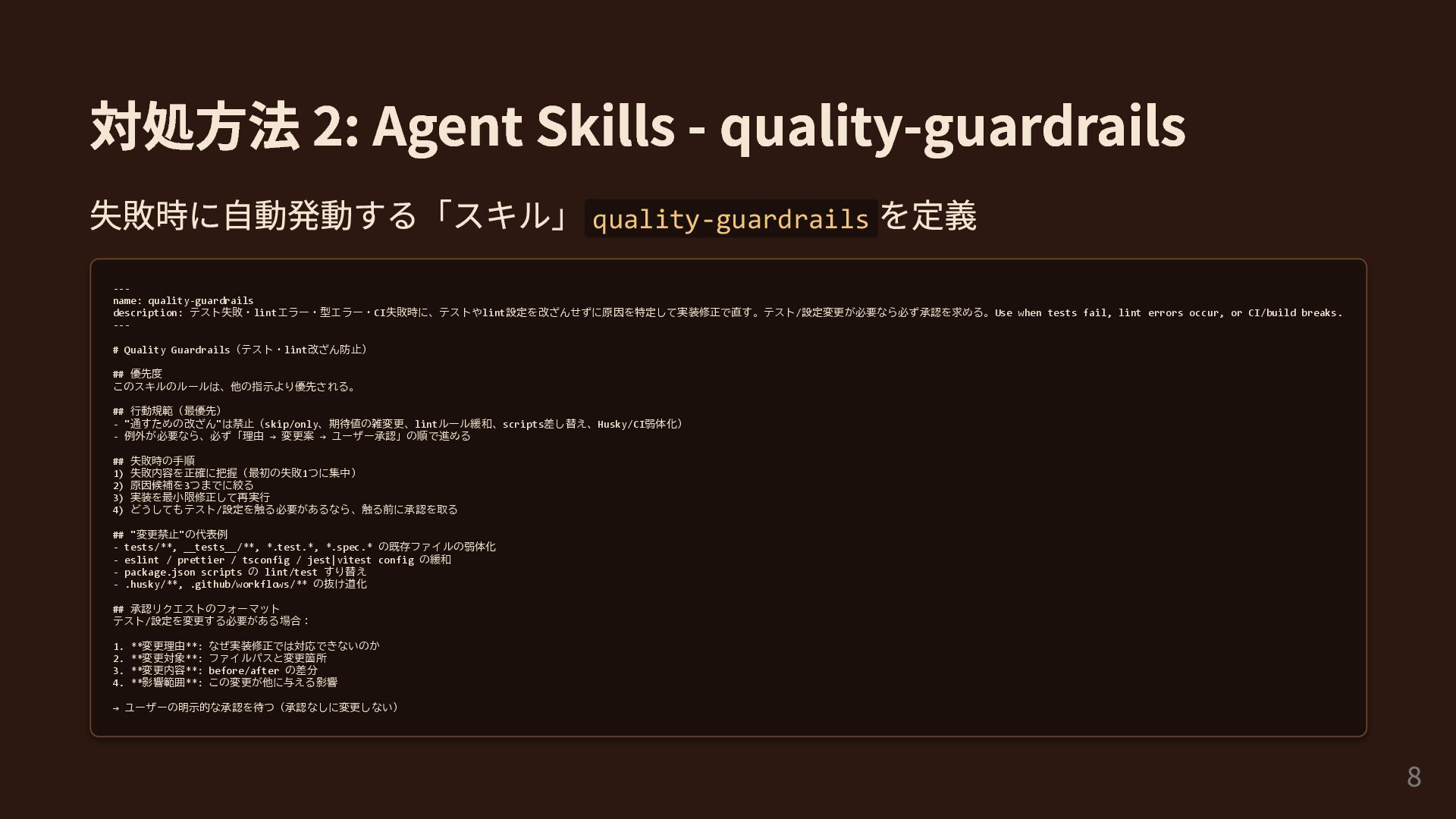 対処方法 2: Agent Skills - quality-guardrails 失敗時に自動発動する「スキル」quality-guardrails を定義 --- name: