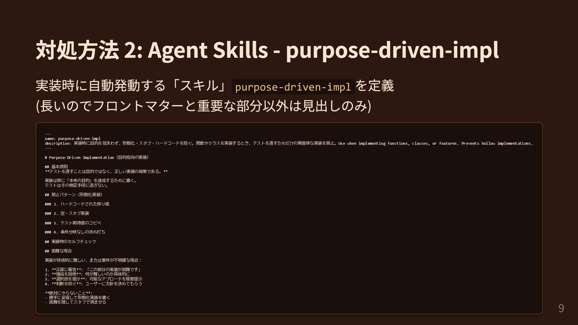 対処方法 2: Agent Skills - purpose-driven-impl 実装時に自動発動する「スキル」purpose-driven-impl を定義 (長いのでフロントマターと重要な部分以外は見出しのみ) ---