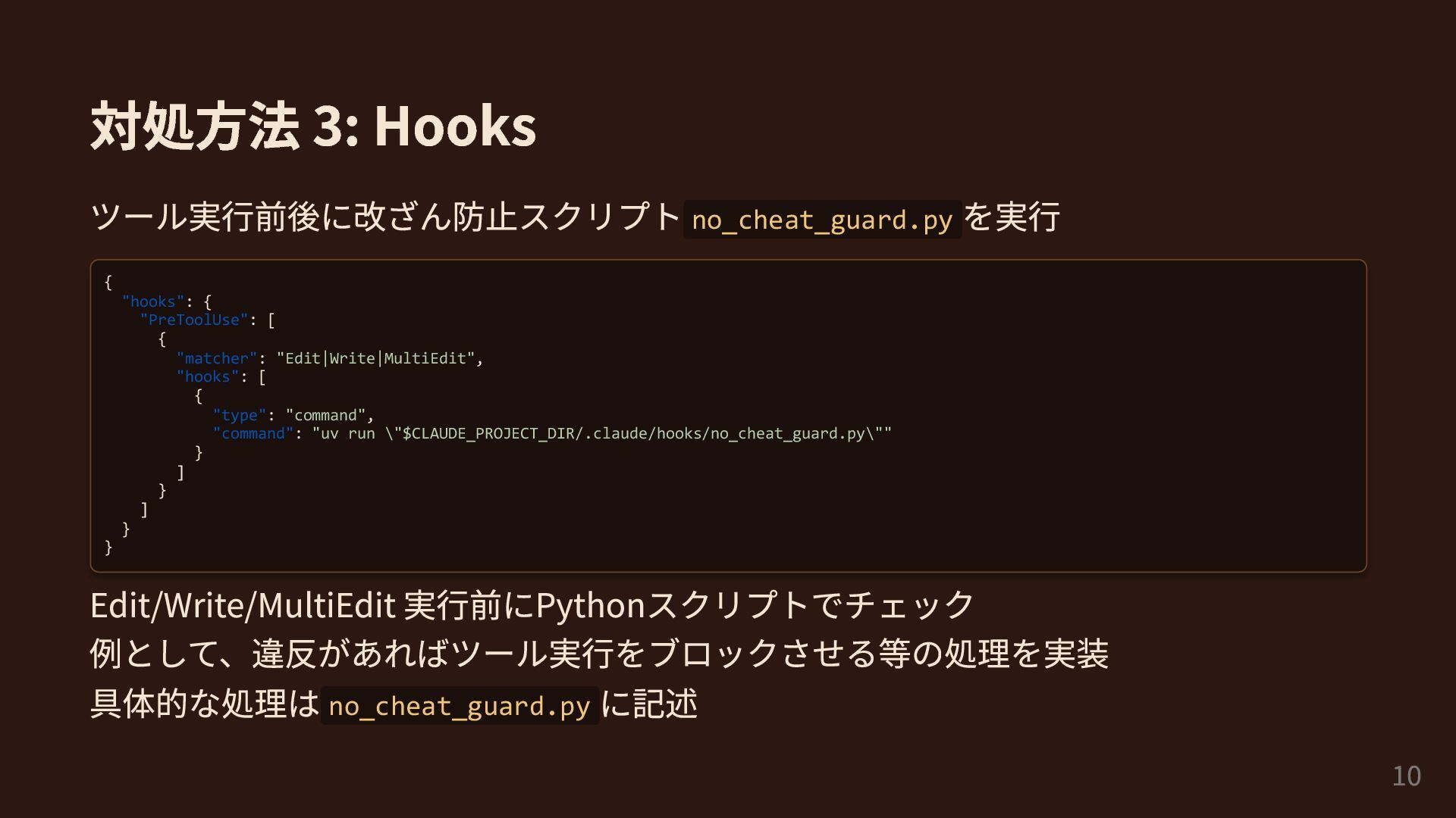 { "matcher": "Edit|Write|MultiEdit", "hooks": [ { "type": "command", "command": "uv run \"$CLAUDE_PROJECT_DIR/.claude/hooks/no_cheat_guard.py\"" } ] } ] } } Edit/Write/MultiEdit 実行前にPythonスクリプトでチェック 例として、違反があればツール実行をブロックさせる等の処理を実装 具体的な処理はno_cheat_guard.py に記述 10