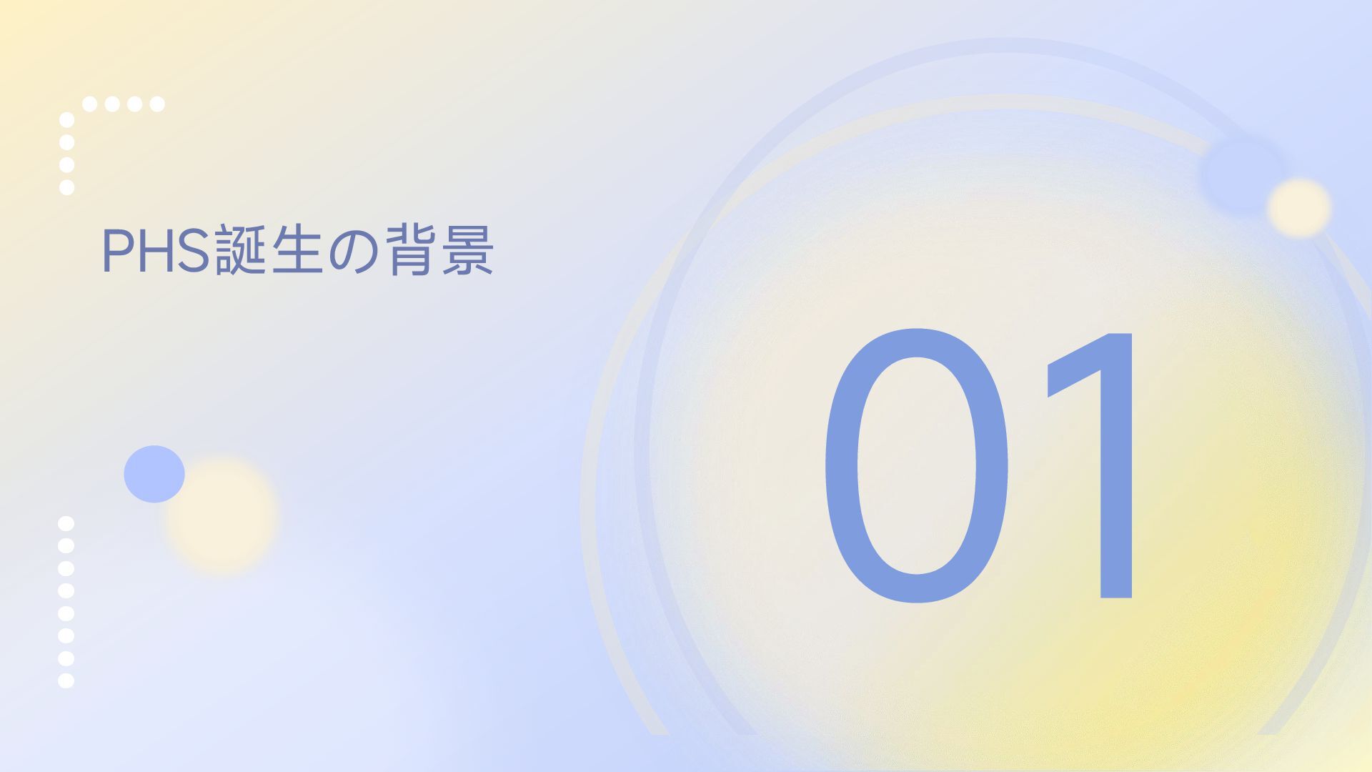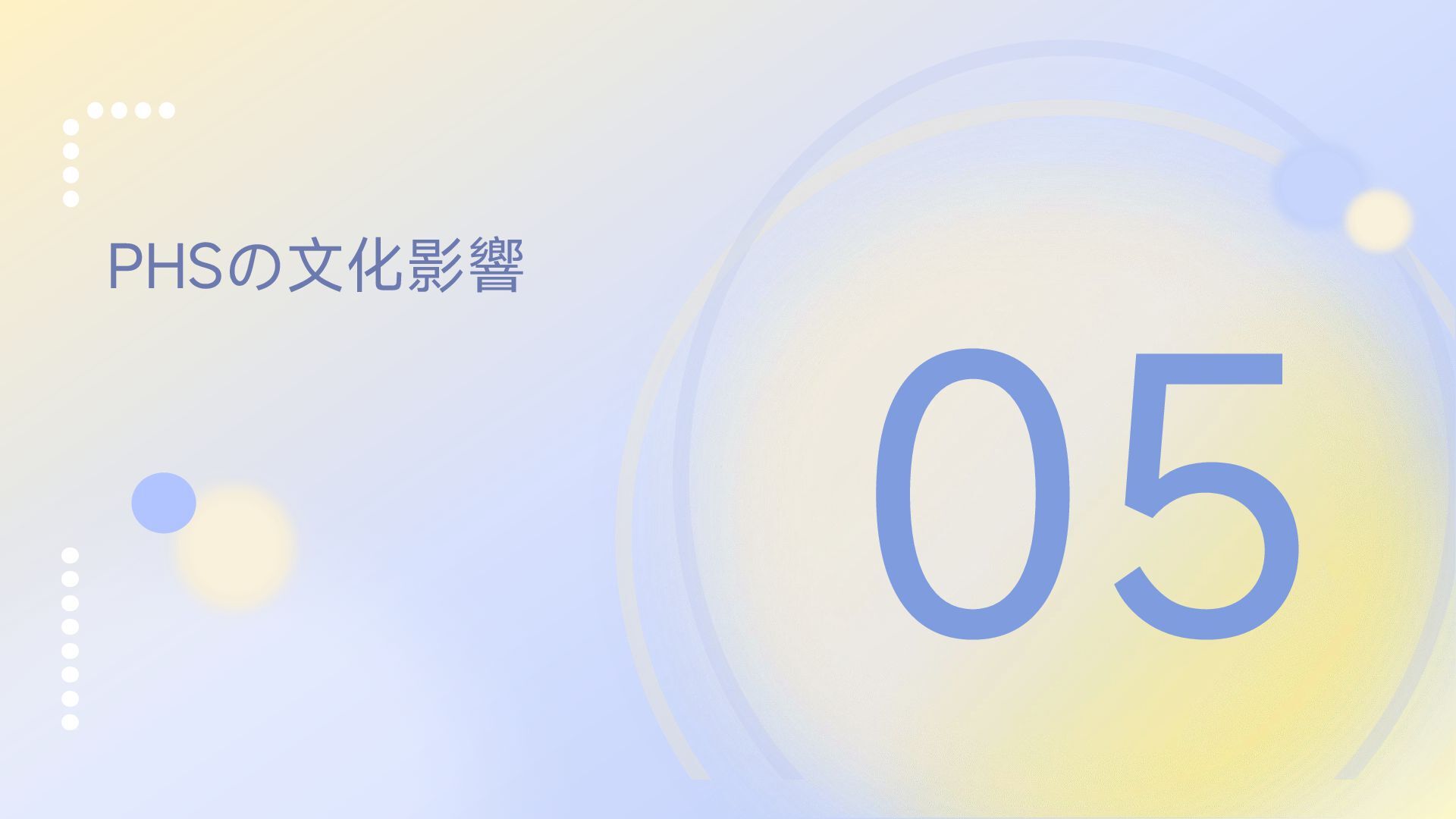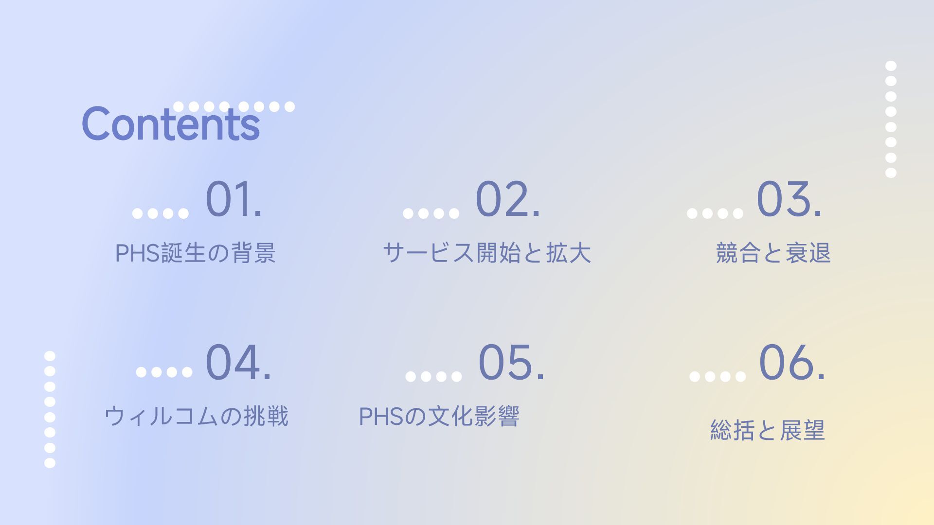PHS誕生の背景 01. 02. サービス開始と拡大 ウィルコムの挑戦 04. 競合と衰退 03. 05. PHSの文化影響