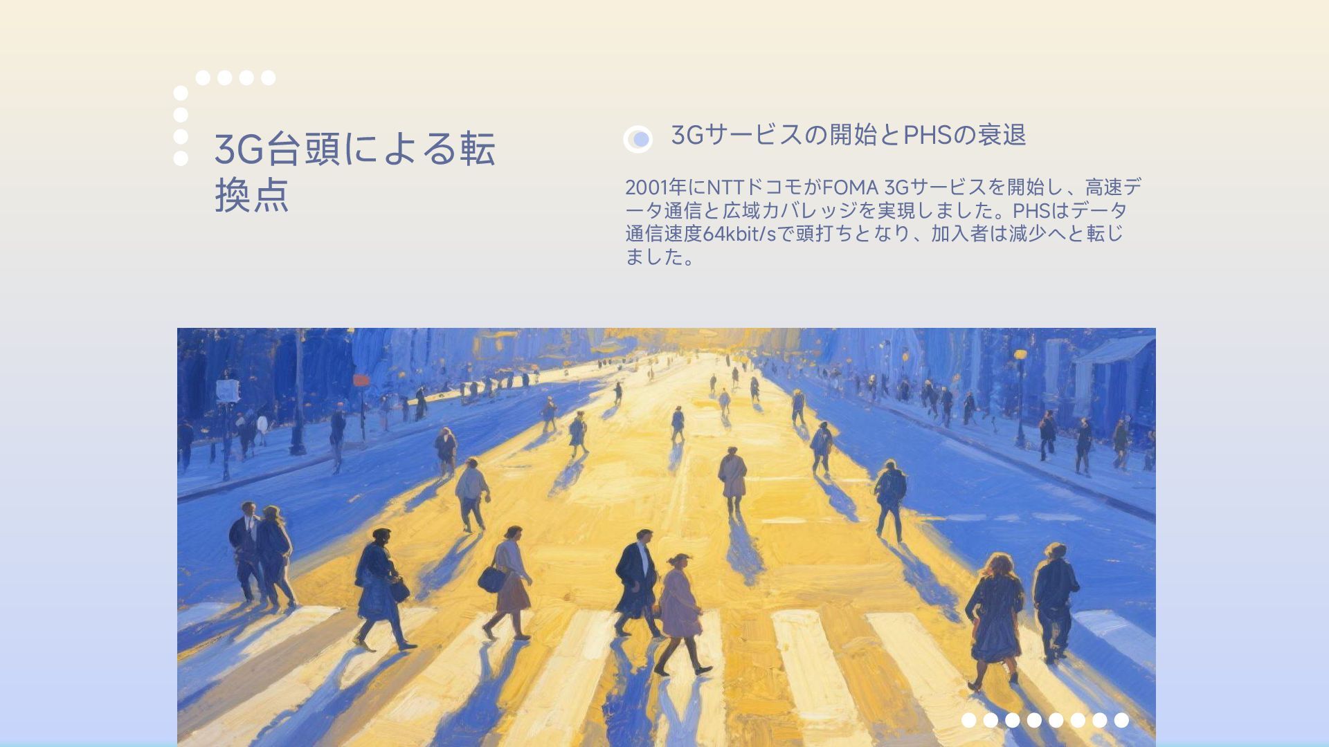 3Gサービスの開始とPHSの衰退 2001年にNTTドコモがFOMA 3Gサービスを開始し、高速デ ータ通信と広域カバレッジを実現しました。PHSはデータ 通信速度64kbit/sで頭打ちとなり、加入者は減少へと転じ ました。 3G台頭による転 換点
