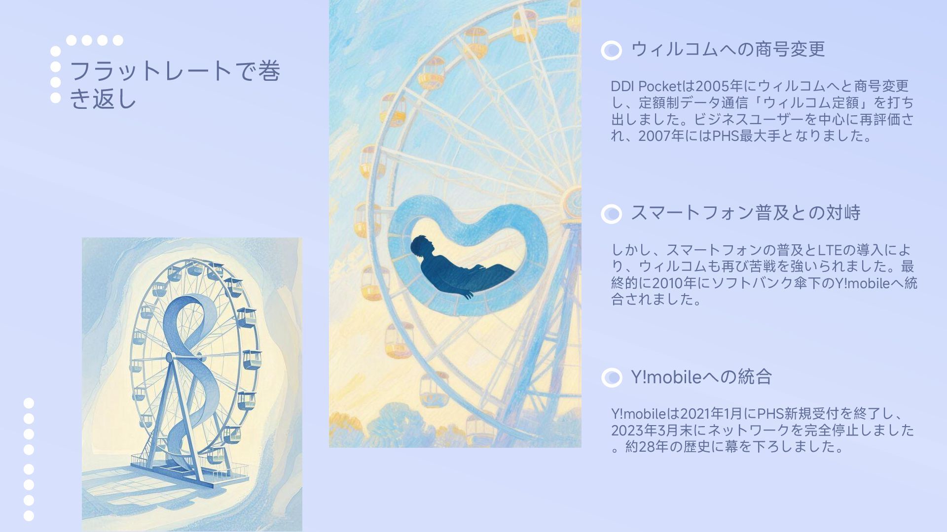 り、ウィルコムも再び苦戦を強いられました。最 終的に2010年にソフトバンク傘下のY!mobileへ統 合されました。 Y!mobileへの統合 Y!mobileは2021年1月にPHS新規受付を終了し、 2023年3月末にネットワークを完全停止しました 。約28年の歴史に幕を下ろしました。