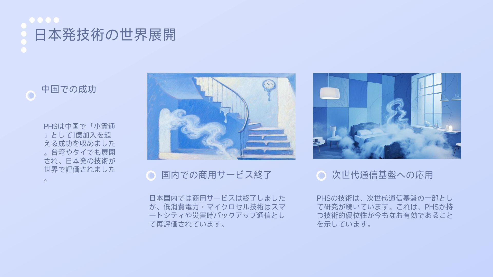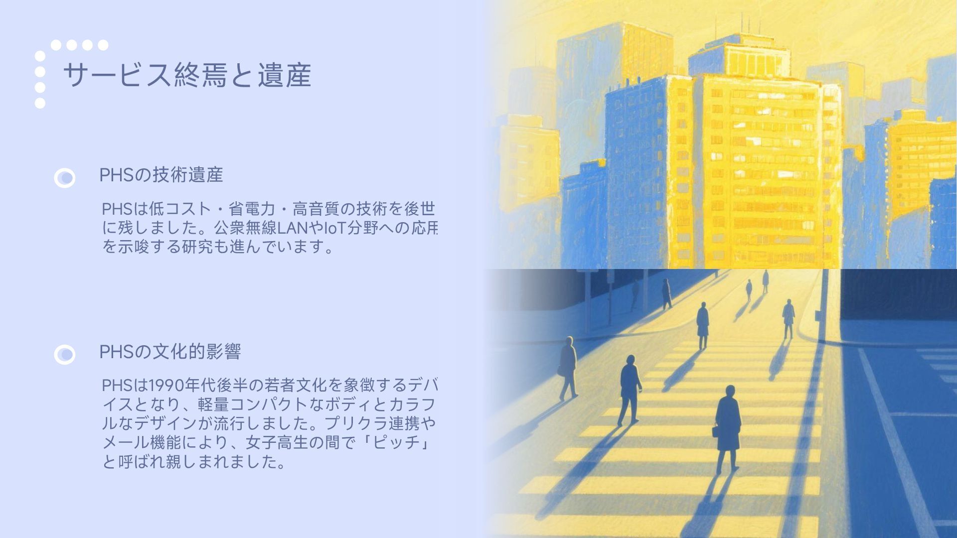 サービス終焉と遺産 PHSの技術遺産 PHSは低コスト・省電力・高音質の技術を後世 に残しました。公衆無線LANやIoT分野への応用 を示唆する研究も進んでいます。 PHSの文化的影響 PHSは1990年代後半の若者文化を象徴するデバ イスとなり、軽量コンパクトなボディとカラフ ルなデザインが流行しました。プリクラ連携や メール機能により、女子高生の間で「ピッチ」