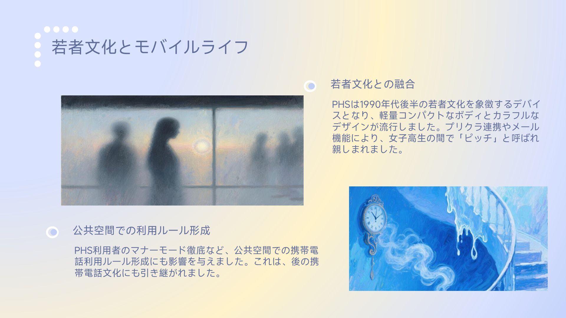 若者文化とモバイルライフ 公共空間での利用ルール形成 PHS利用者のマナーモード徹底など、公共空間での携帯電 話利用ルール形成にも影響を与えました。これは、後の携 帯電話文化にも引き継がれました。 若者文化との融合 PHSは1990年代後半の若者文化を象徴するデバイ スとなり、軽量コンパクトなボディとカラフルな デザインが流行しました。プリクラ連携やメール 機能により、女子高生の間で「ピッチ」と呼ばれ