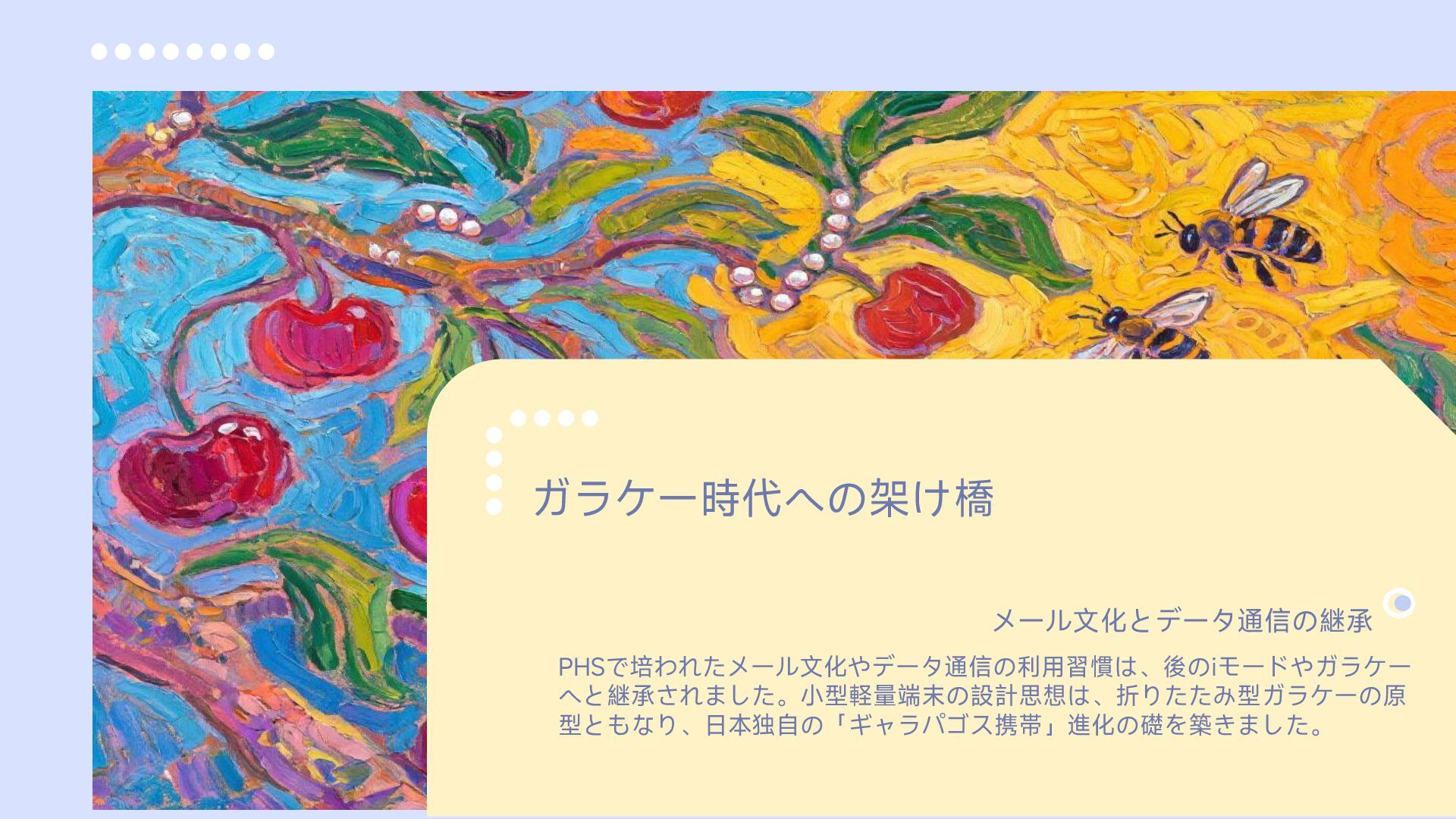 ガラケー時代への架け橋 メール文化とデータ通信の継承 PHSで培われたメール文化やデータ通信の利用習慣は、後のiモードやガラケー へと継承されました。小型軽量端末の設計思想は、折りたたみ型ガラケーの原 型ともなり、日本独自の「ギャラパゴス携帯」進化の礎を築きました。