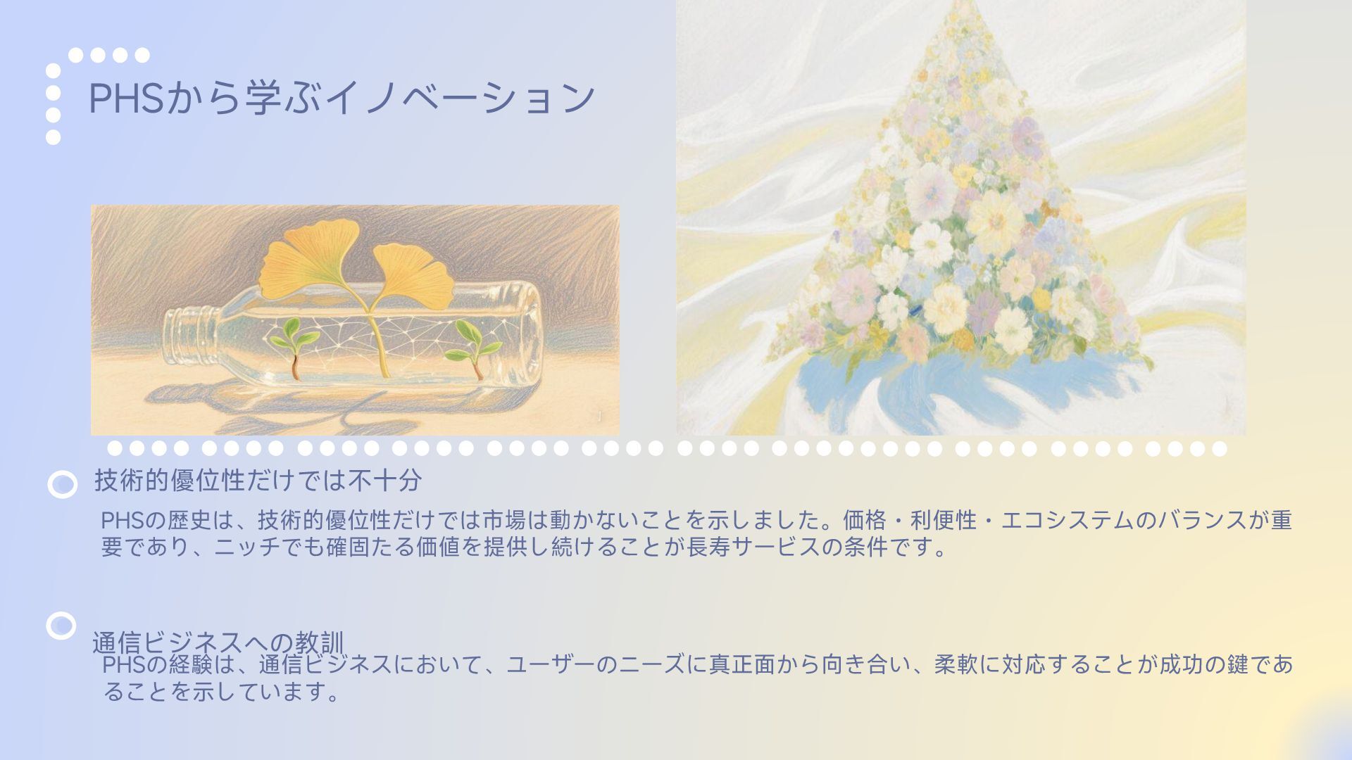 技術的優位性だけでは不十分 PHSの歴史は、技術的優位性だけでは市場は動かないことを示しました。価格・利便性・エコシステムのバランスが重 要であり、ニッチでも確固たる価値を提供し続けることが長寿サービスの条件です。 PHSから学ぶイノベーション 通信ビジネスへの教訓 PHSの経験は、通信ビジネスにおいて、ユーザーのニーズに真正面から向き合い、柔軟に対応することが成功の鍵であ ることを示しています。