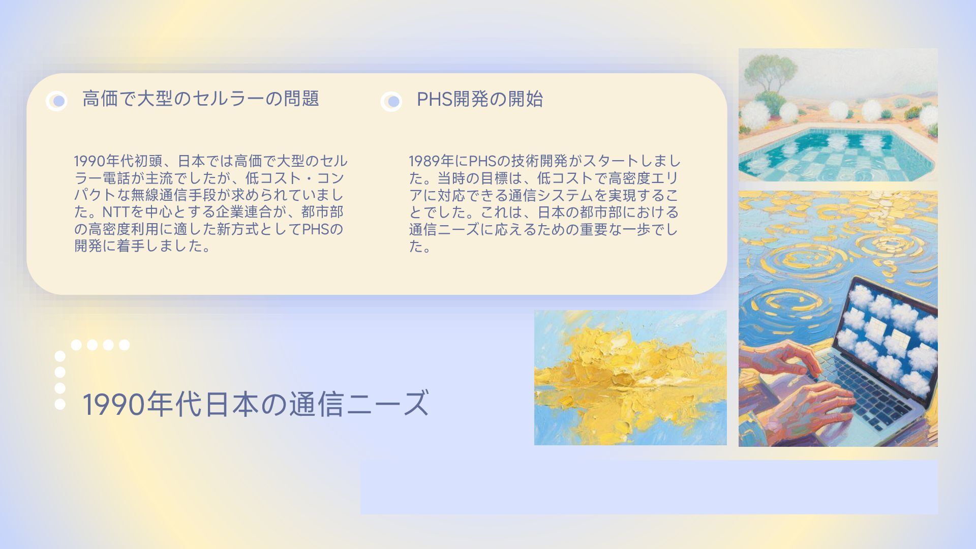 高価で大型のセルラーの問題 1990年代初頭、日本では高価で大型のセル ラー電話が主流でしたが、低コスト・コン パクトな無線通信手段が求められていまし た。NTTを中心とする企業連合が、都市部 の高密度利用に適した新方式としてPHSの 開発に着手しました。 PHS開発の開始 1989年にPHSの技術開発がスタートしまし た。当時の目標は、低コストで高密度エリ