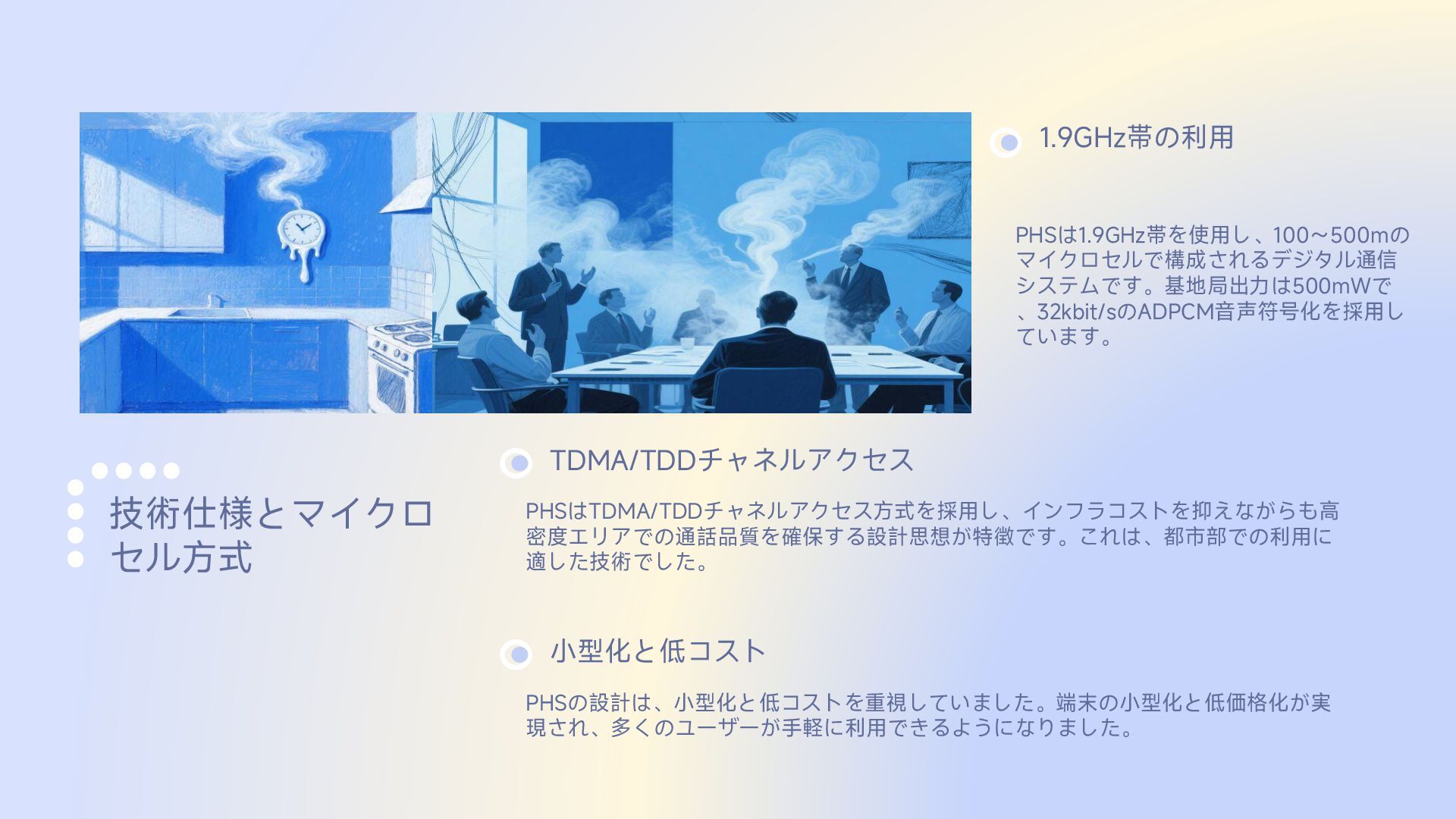 TDMA/TDDチャネルアクセス PHSはTDMA/TDDチャネルアクセス方式を採用し、インフラコストを抑えながらも高 密度エリアでの通話品質を確保する設計思想が特徴です。これは、都市部での利用に 適した技術でした。 1.9GHz帯の利用 PHSは1.9GHz帯を使用し、100~500mの マイクロセルで構成されるデジタル通信 システムです。基地局出力は500mWで 、32kbit/sのADPCM音声符号化を採用し ています。