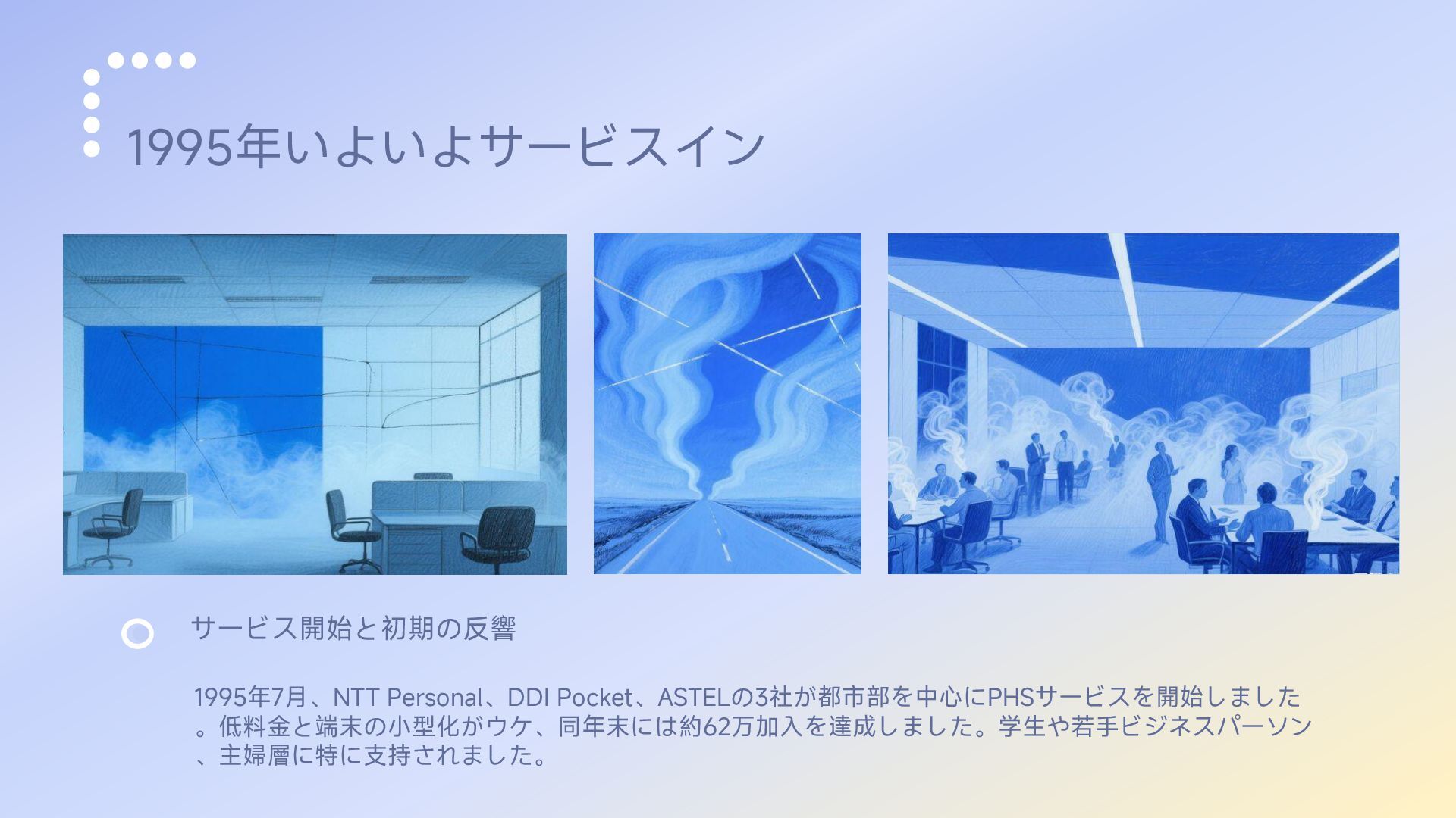 1995年いよいよサービスイン サービス開始と初期の反響 1995年7月、NTT Personal、DDI Pocket、ASTELの3社が都市部を中心にPHSサービスを開始しました 。低料金と端末の小型化がウケ、同年末には約62万加入を達成しました。学生や若手ビジネスパーソン 、主婦層に特に支持されました。