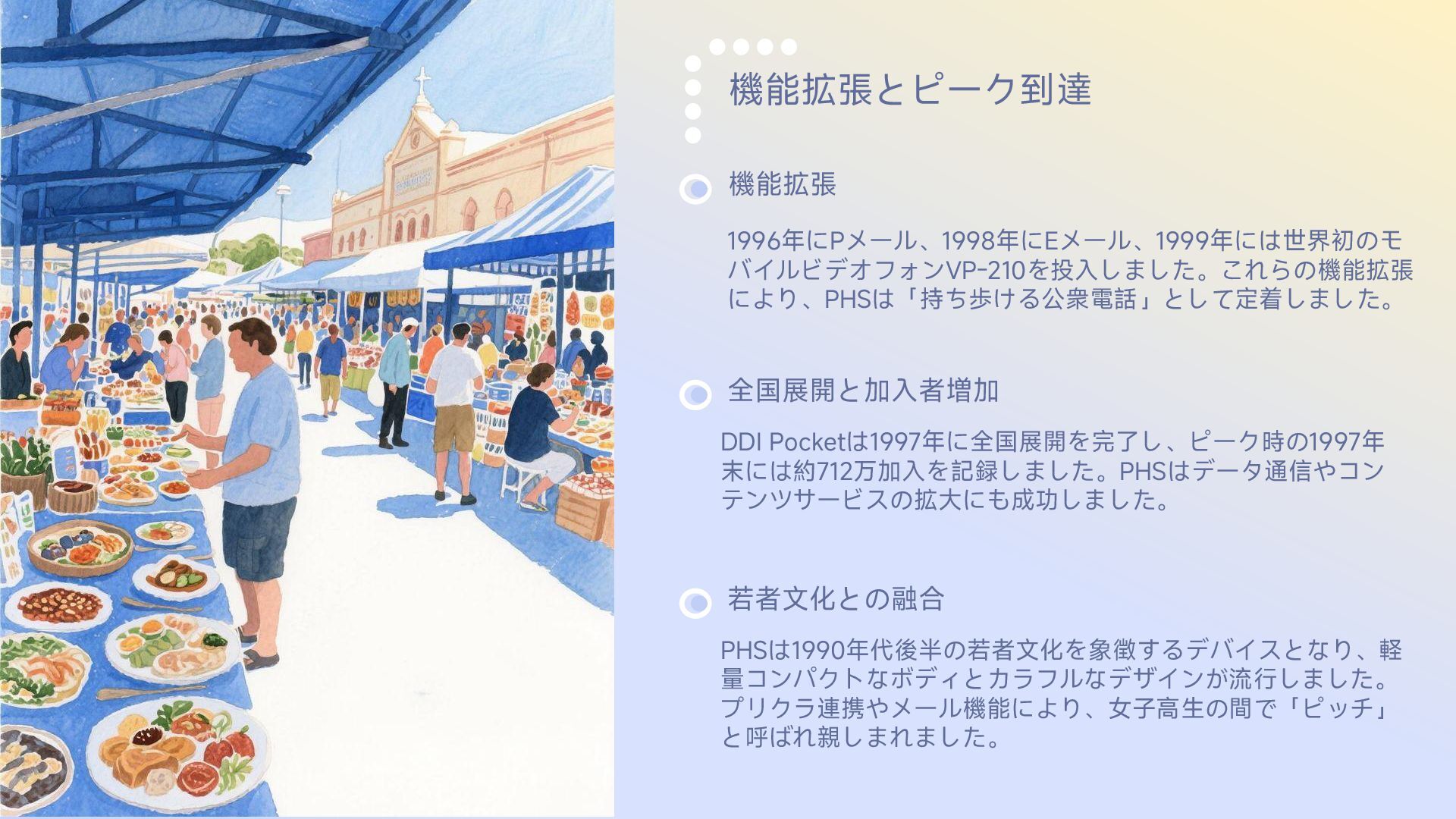 機能拡張とピーク到達 若者文化との融合 PHSは1990年代後半の若者文化を象徴するデバイスとなり、軽 量コンパクトなボディとカラフルなデザインが流行しました。 プリクラ連携やメール機能により、女子高生の間で「ピッチ」 と呼ばれ親しまれました。 機能拡張 1996年にPメール、1998年にEメール、1999年には世界初のモ バイルビデオフォンVP-210を投入しました。これらの機能拡張 により、PHSは「持ち歩ける公衆電話」として定着しました。