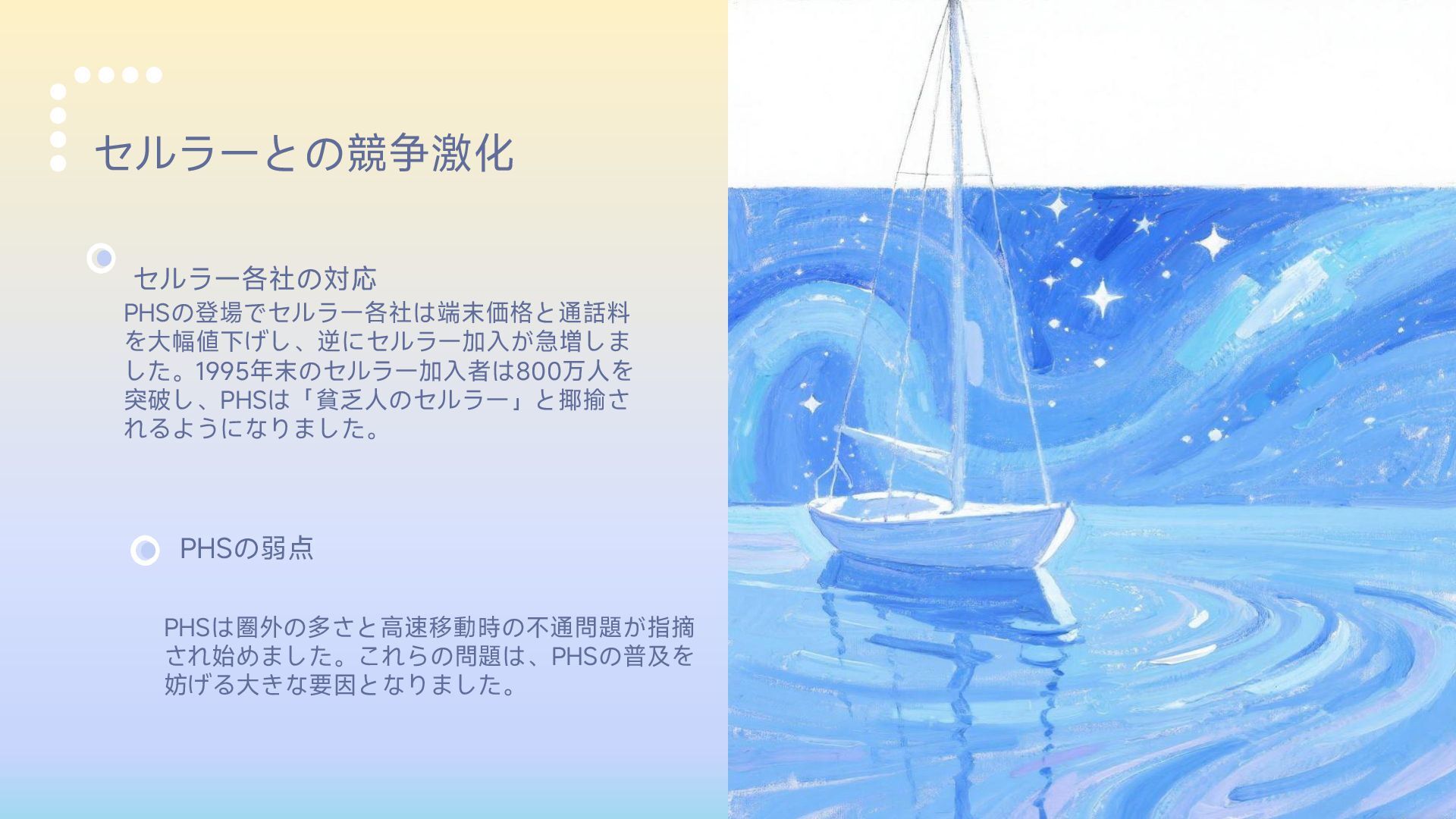 セルラーとの競争激化 セルラー各社の対応 PHSの登場でセルラー各社は端末価格と通話料 を大幅値下げし、逆にセルラー加入が急増しま した。1995年末のセルラー加入者は800万人を 突破し、PHSは「貧乏人のセルラー」と揶揄さ れるようになりました。 PHSの弱点 PHSは圏外の多さと高速移動時の不通問題が指摘 され始めました。これらの問題は、PHSの普及を