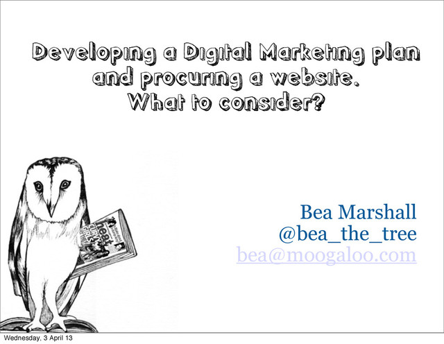 website Look at their portfolio Talk to their clients Gut instinct Talk to them directly Do they ask “Do you know what you want?”? Source 3 proposals/quotes Wednesday, 3 April 13