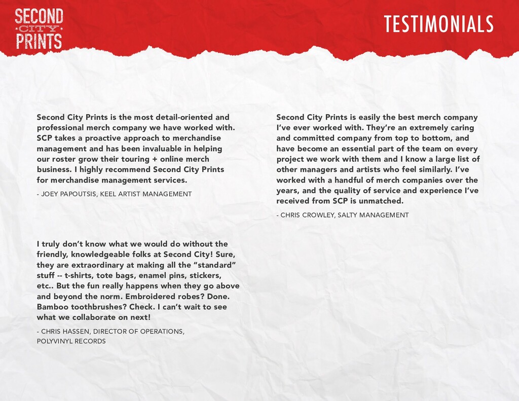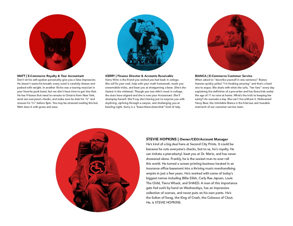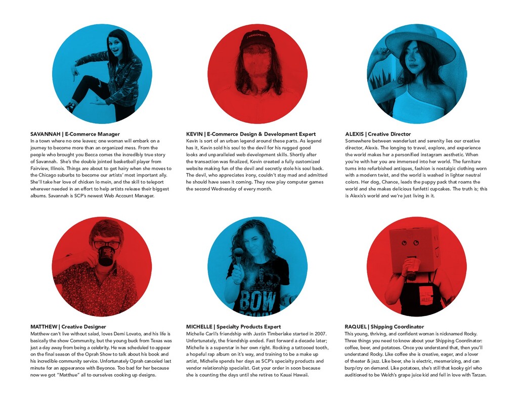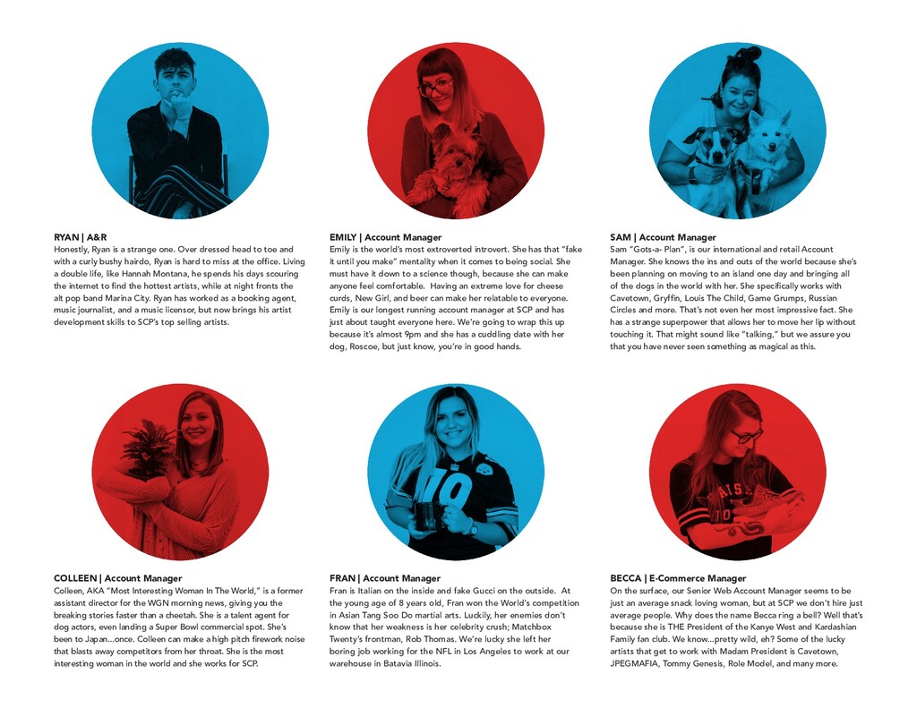 introvert. She has that “fake it until you make” mentality when it comes to being social. She must have it down to a science though, because she can make anyone feel comfortable. Having an extreme love for cheese curds, New Girl, and beer can make her relatable to everyone. Emily is our longest running account manager at SCP and has just about taught everyone here. We’re going to wrap this up because it’s almost 9pm and she has a cuddling date with her dog, Roscoe, but just know, you’re in good hands. FRAN | Account Manager Fran is Italian on the inside and fake Gucci on the outside. At the young age of 8 years old, Fran won the World’s competition in Asian Tang Soo Do martial arts. Luckily, her enemies don’t know that her weakness is her celebrity crush; Matchbox Twenty’s frontman, Rob Thomas. We’re lucky she left her boring job working for the NFL in Los Angeles to work at our warehouse in Batavia Illinois. SAM | Account Manager Sam “Gots-a- Plan”, is our international and retail Account Manager. She knows the ins and outs of the world because she’s been planning on moving to an island one day and bringing all of the dogs in the world with her. She specifically works with Cavetown, Gryffin, Louis The Child, Game Grumps, Russian Circles and more. That’s not even her most impressive fact. She has a strange superpower that allows her to move her lip without touching it. That might sound like “talking,” but we assure you that you have never seen something as magical as this. BECCA | E-Commerce Manager On the surface, our Senior Web Account Manager seems to be just an average snack loving woman, but at SCP we don’t hire just average people. Why does the name Becca ring a bell? Well that’s because she is THE President of the Kanye West and Kardashian Family fan club. We know...pretty wild, eh? Some of the lucky artists that get to work with Madam President is Cavetown, JPEGMAFIA, Tommy Genesis, Role Model, and many more. COLLEEN | Account Manager Colleen, AKA “Most Interesting Woman In The World,” is a former assistant director for the WGN morning news, giving you the breaking stories faster than a cheetah. She is a talent agent for dog actors, even landing a Super Bowl commercial spot. She’s been to Japan...once. Colleen can make a high pitch firework noise that blasts away competitors from her throat. She is the most interesting woman in the world and she works for SCP. RYAN | A&R Honestly, Ryan is a strange one. Over dressed head to toe and with a curly bushy hairdo, Ryan is hard to miss at the office. Living a double life, like Hannah Montana, he spends his days scouring the internet to find the hottest artists, while at night fronts the alt pop band Marina City. Ryan has worked as a booking agent, music journalist, and a music licensor, but now brings his artist development skills to SCP’s top selling artists.