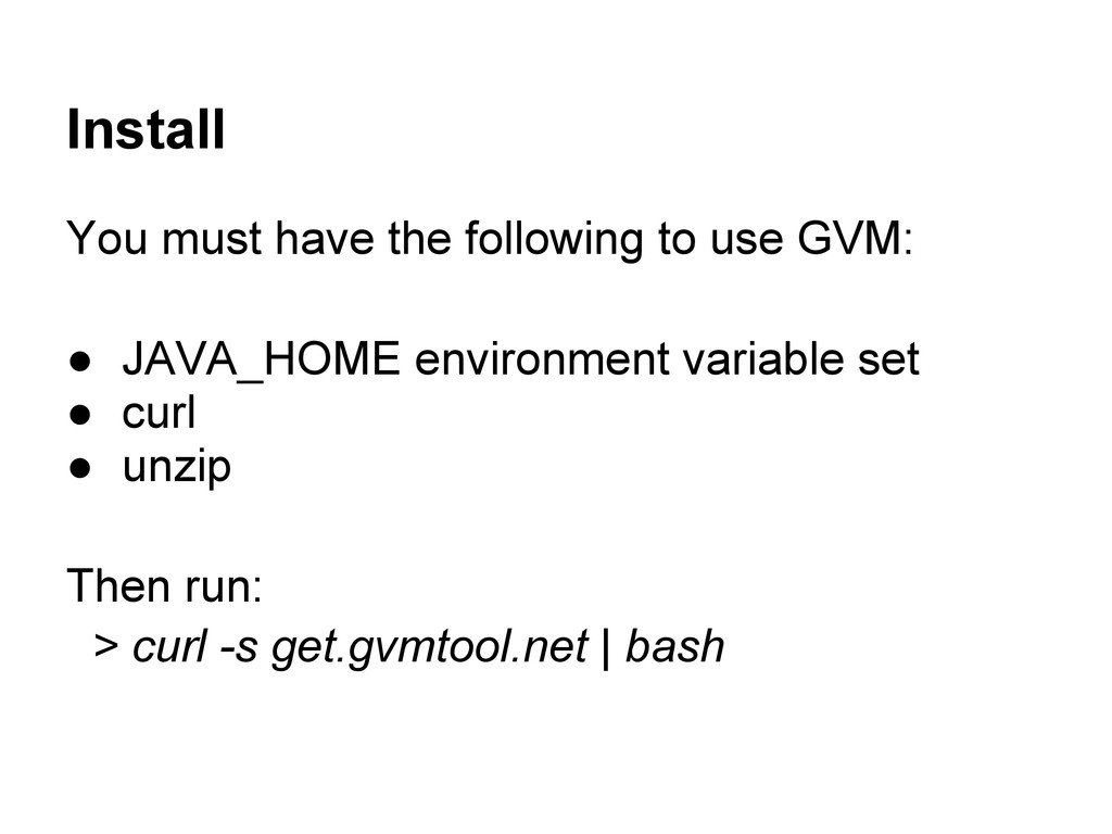 JAVA_HOME environment variable set • curl • unzip Then run: > curl -s get.gvmtool.net | bash