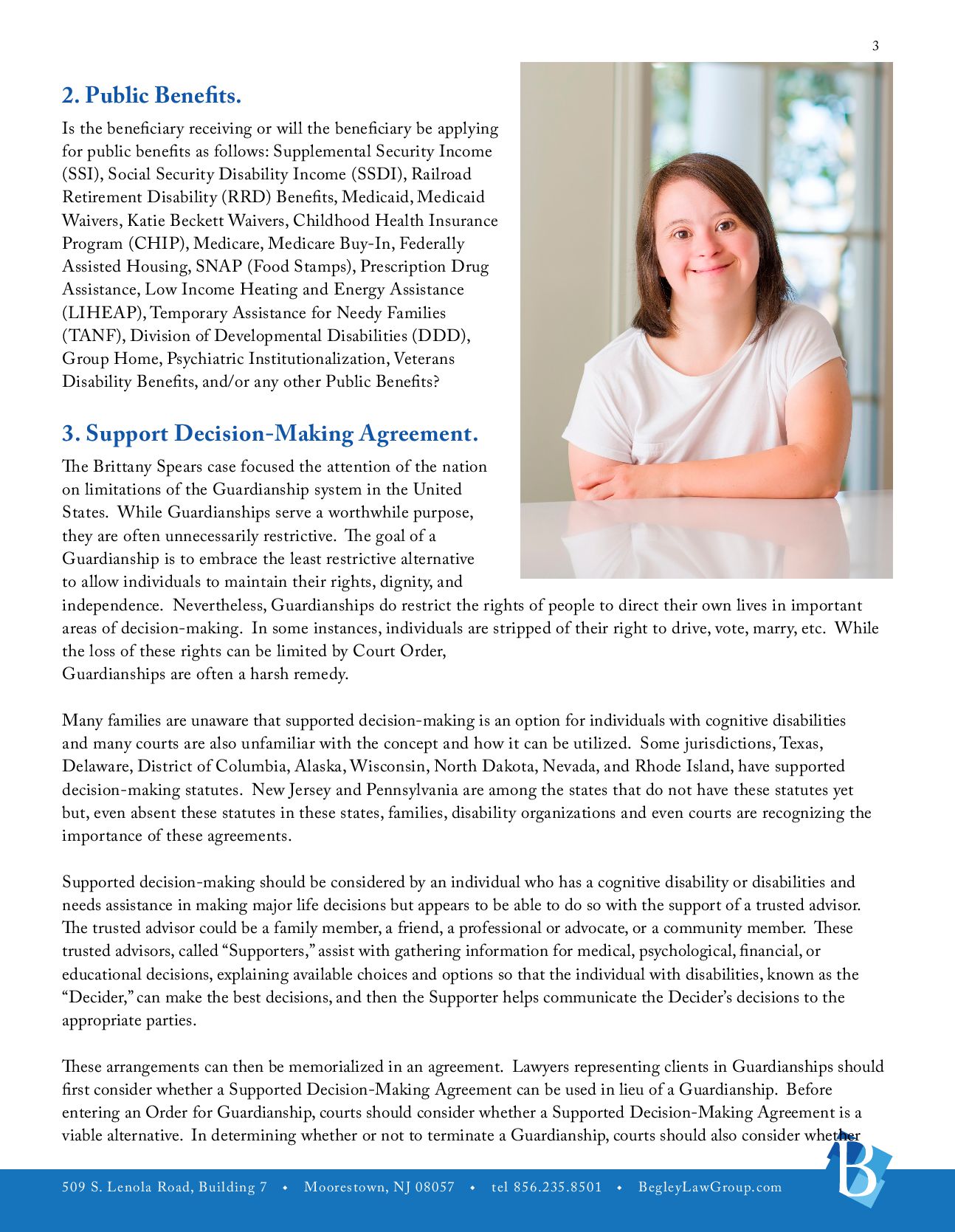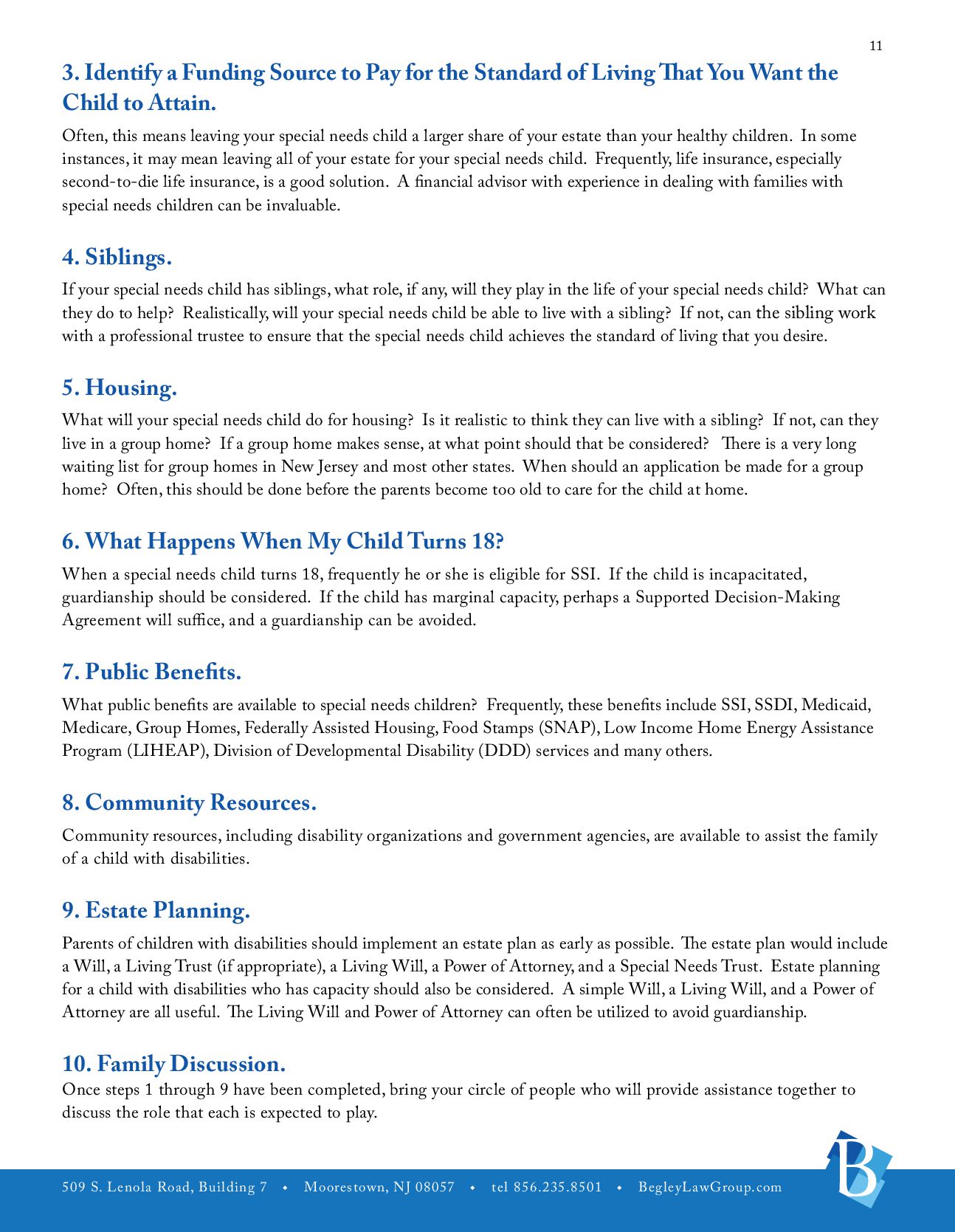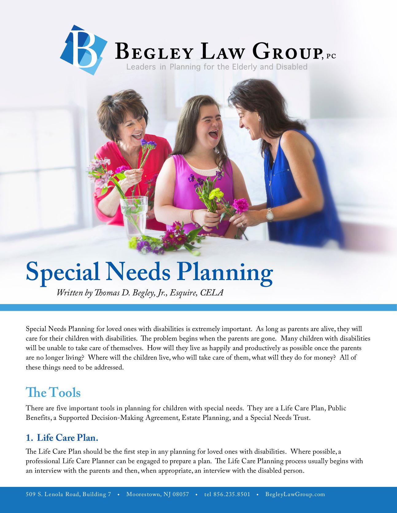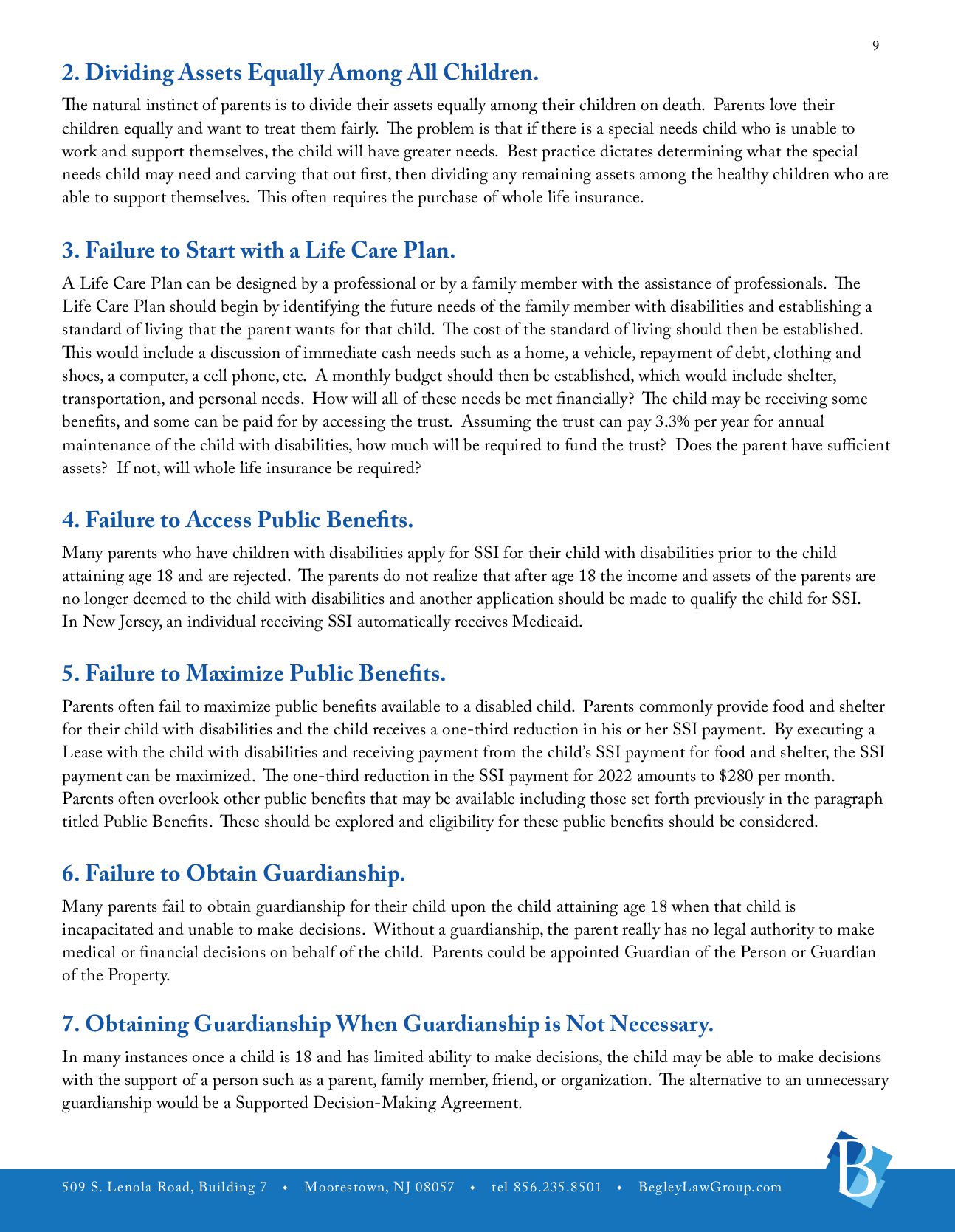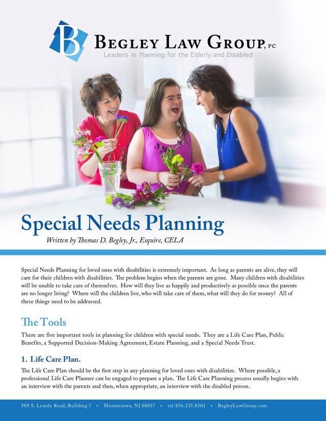 u tel 856.235.8501 u BegleyLawGroup.com 2 a. The Players. The Life Care Plan outlines who the important players are in the life of the individual with disabilities. The players would include the person with disabilities, parents, guardians, trustees, important contacts, involved family members, pets, and friends. b. Medical Information. Information should be gathered concerning the individual with disabilities’ physicians, therapists and specialists, prognosis, medical coverage, preferred hospital and pharmacy, necessary medications, treatments or special care, allergies, emergency instructions, and whether the individual needs assistance with taking medicine (i.e., insulin, shots, or certain pills). c. Public Benefits. Public benefits that the individual may be receiving, whether those benefits can be maximized, and additional public benefits that may be able to be accessed. d. Abilities and Disabilities. What are the abilities and disabilities of the individual with disabilities including limitations, extraordinary powers, medical or adaptive equipment/supplies, interaction with others, stress, and change? e. Personal Characteristics. These would include genera, personality, preferences, likes and dislikes, interests, male/female attendant, clothing, favorite places, and sizes. f. Activities. These would include housework, recreation, daily routines, visitation, work experience, and school. g. Personal Care. What type of personal care does the individual need? These would include assistance, dressing, bathing, hair care, shaving, using the toilet, other personal hygiene, special reminders, and special instructions. h. Meals. These would include preparation of meals, food allergies, likes and dislikes, eating assistance, and other. i. Care and Supervision. j. Housing. k.Employment. This would include current employment status and assistance in obtaining employment. l. Social Activities. m. Transportation. n. Religion. o. Hopes and Expectations. These would include hopes, necessary action, additional information, additional instructions. p. Estate Planning. Is Estate Planning possible? How would it be accomplished? q. Guardianship. Does the person with disabilities need a Guardianship?