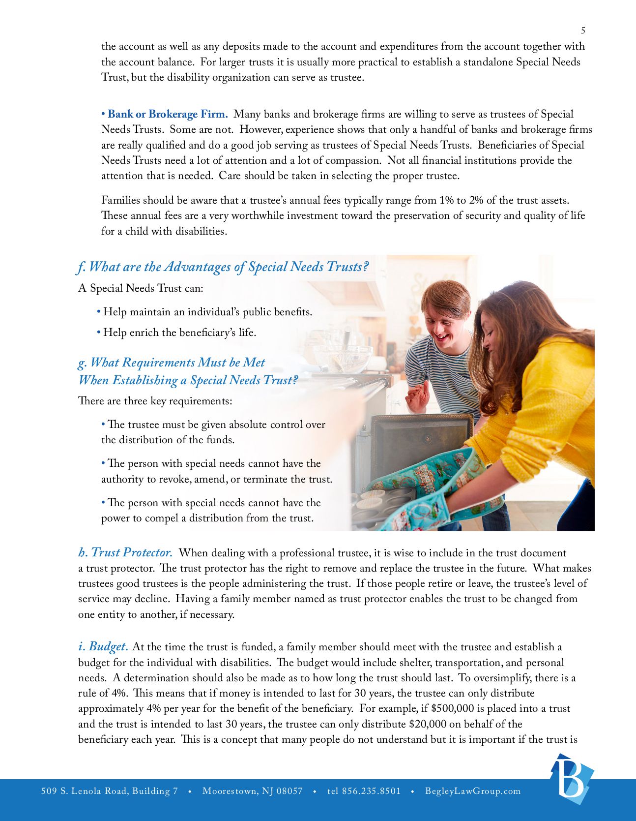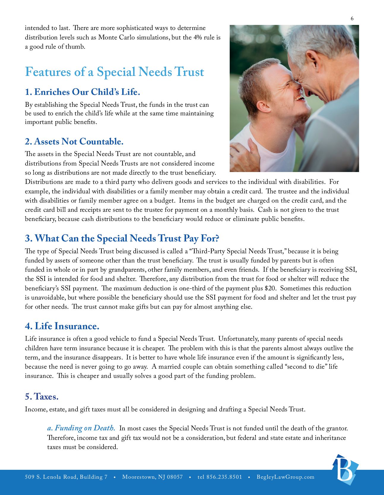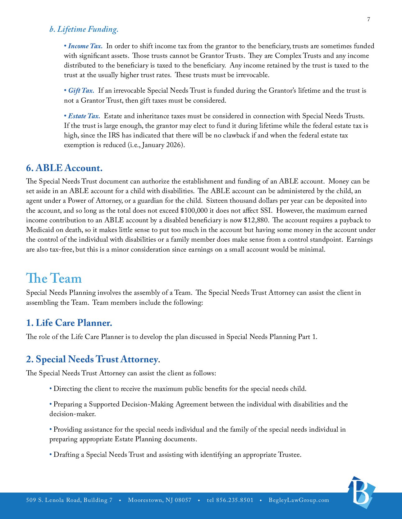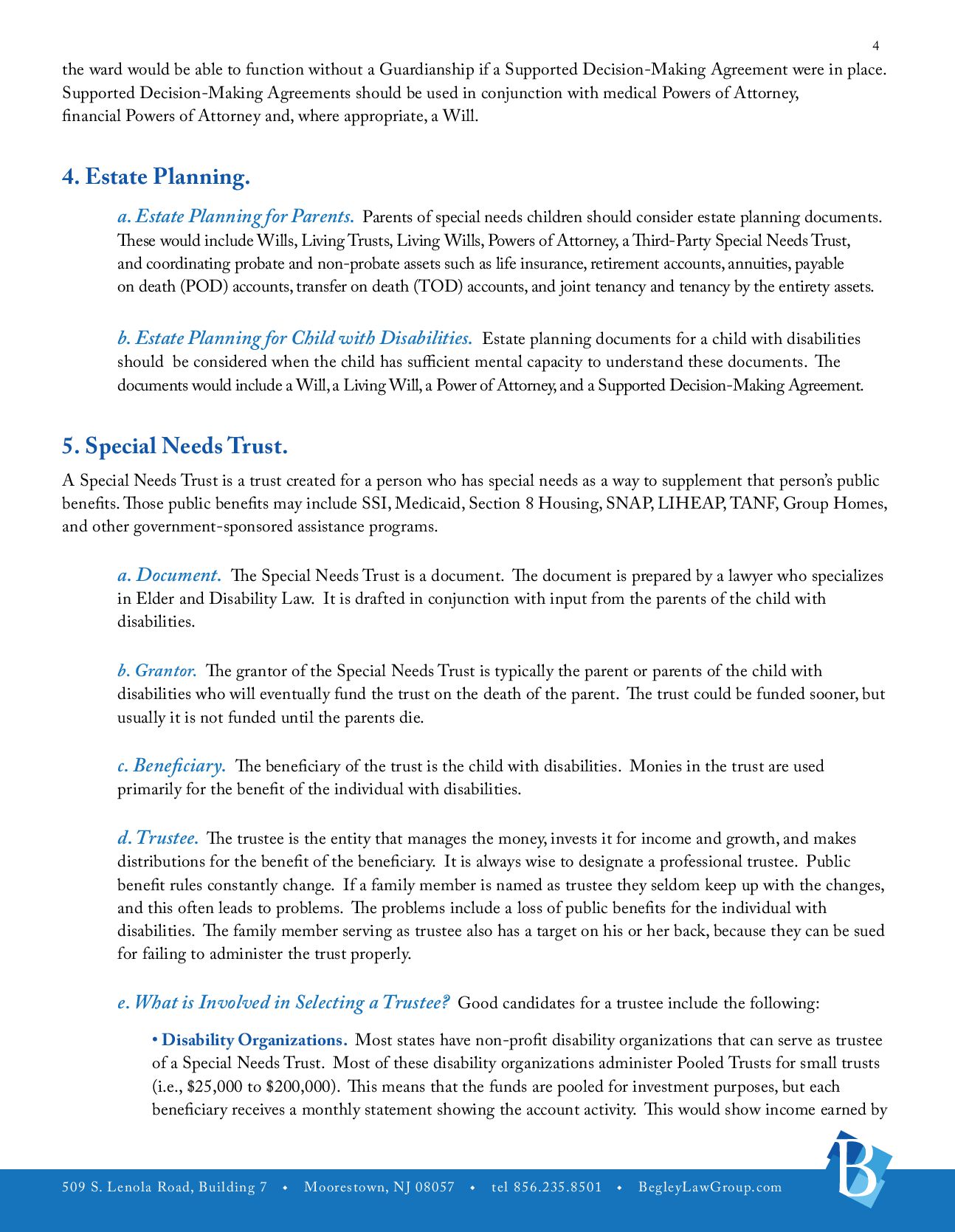 u tel 856.235.8501 u BegleyLawGroup.com 2 a. The Players. The Life Care Plan outlines who the important players are in the life of the individual with disabilities. The players would include the person with disabilities, parents, guardians, trustees, important contacts, involved family members, pets, and friends. b. Medical Information. Information should be gathered concerning the individual with disabilities’ physicians, therapists and specialists, prognosis, medical coverage, preferred hospital and pharmacy, necessary medications, treatments or special care, allergies, emergency instructions, and whether the individual needs assistance with taking medicine (i.e., insulin, shots, or certain pills). c. Public Benefits. Public benefits that the individual may be receiving, whether those benefits can be maximized, and additional public benefits that may be able to be accessed. d. Abilities and Disabilities. What are the abilities and disabilities of the individual with disabilities including limitations, extraordinary powers, medical or adaptive equipment/supplies, interaction with others, stress, and change? e. Personal Characteristics. These would include genera, personality, preferences, likes and dislikes, interests, male/female attendant, clothing, favorite places, and sizes. f. Activities. These would include housework, recreation, daily routines, visitation, work experience, and school. g. Personal Care. What type of personal care does the individual need? These would include assistance, dressing, bathing, hair care, shaving, using the toilet, other personal hygiene, special reminders, and special instructions. h. Meals. These would include preparation of meals, food allergies, likes and dislikes, eating assistance, and other. i. Care and Supervision. j. Housing. k.Employment. This would include current employment status and assistance in obtaining employment. l. Social Activities. m. Transportation. n. Religion. o. Hopes and Expectations. These would include hopes, necessary action, additional information, additional instructions. p. Estate Planning. Is Estate Planning possible? How would it be accomplished? q. Guardianship. Does the person with disabilities need a Guardianship?