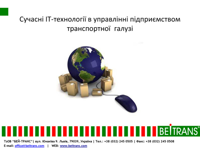 +38 (032) 245 0505 | Факс: +38 (032) 245 0508 E-mail: [email protected] | WEB: www.beitrans.com Автоматизація транспортного підприємства Для чого підприємствам транспортної галузі взагалі потрібна автоматизація процесів і управління? 1. Зростання кількості і складності інформації. 2. Старі (сірі) схеми почасти не актуальні. Нові схеми вимагають значної економії коштів. 3. Потрібні професійні інструменти обліку. 4. Зростання ролі інформаційних технологій – гарантія успіху підприємства в глобальній економіці.