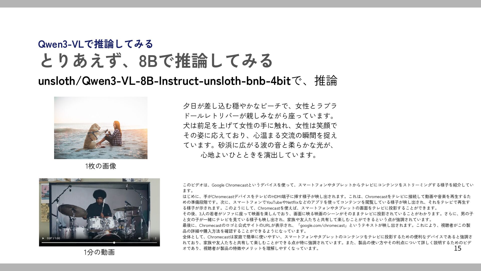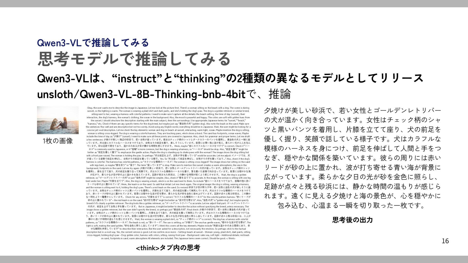 to describe the image in Japanese. Let me look at the picture first. There's a woman sitting on the beach with a dog. The scene is during sunset, so the lighting is warm. The woman is wearing a plaid shirt and dark pants, and she's holding the dog's paw. The dog is a golden retriever or similar breed, sitting next to her, wearing a harness with colorful patterns. I need to make sure I capture all the details: the beach setting, the time of day (sunset), their interaction, the dog's harness, the woman's clothing, the ocean in the background. Also, the mood is peaceful and happy. The colors are soft with golden hues from the sunset. I should structure the description starting with the main subject, then the surroundings. Use appropriate Japanese terms for "sunset," "beach," "harness," etc. Check if there are any specific terms for the dog breed, but maybe just say "黄金色の犬" (golden dog). Also note the leash on the sand. Make sure the sentences flow well and are descriptive but not too wordy. Avoid using any English words; everything should be in Japanese. Wait, the user might be looking for a concise yet vivid description. Let me check the key elements: woman and dog on beach at sunset, interacting, warm light, ocean. Maybe mention the dog is sitting, woman is sitting cross-legged. The dog is wearing a colorful harness. They are touching paws, which shows a bond. The sand has footprints, ocean waves. Maybe include the time of day as "夕焼け" (sunset). I need to make sure all these points are covered in Japanese. Also, check for grammar and proper terms. Let me draft a few sentences: 夕焼けが美しい海辺の砂浜で、若い女性が座っています。彼女はチェック柄のシャツとダークカラーのパンツを着用し、黄金色の犬と一緒に座 っています。犬は首にカラフルなハーネスをつけており、女性はその前足を握り、楽しそうにしています。背景には青い海と波が見え、柔らかい光が二人を包ん でいます。砂は足跡で満ちており、温かみのある夕日が静かな時間を感じさせます。 Hmm, maybe "首にカラフルなハーネスをつけて" is correct. Check if "ハー ネス" is commonly used in Japanese, or if "首輪" is more common, but the dog is wearing a harness, so "ハーネス" should be okay. Also, "前足を握り" might be better as "前足を優しく握り" to emphasize the gentle action. Maybe the dog is standing up to shake paws with the woman? The image shows the dog sitting but with a front paw raised. The woman is holding the paw. So perhaps "犬は前足を上げ、女性が手を握っている" would be accurate. Let me adjust: イメージでは、犬 が座っている姿勢で前足を伸ばし、女性がその前足を握っている様子。Yes. So "犬は座って前足を伸ばし、女性がその手を握っており..." Also, check if the dog's harness is colorful. The harness has colorful patterns, so "カラフルな模様のハーネス". The woman is sitting cross-legged? The image shows her sitting on the sand with legs bent, so maybe "膝を折り" or "座り". The term "座っています" is okay. Make sure to mention the sunset creates a warm atmosphere, the sea in the background, footprints in the sand. Let me try again: 夕焼けの美しい砂浜で、若い女性とゴールデンレトリバーの犬が座っています。女性はチェック柄のシャツ を着用し、膝を立てて座り、犬の前足を握り合って笑顔です。犬はカラフルな模様のハーネスを着け、落ち着いた姿勢で向き合っています。背景には穏やかな海 が広がり、柔らかな夕日が砂の上に温かみを加えています。足跡が刻まれた砂浜は、この静かな時間が続くよう感じさせます。 Wait, the dog is a golden retriever, so "ゴールデンレトリバーの犬" or just "金色の犬" might be simpler. Also, check if "膝を立てて" is accurate. In the image, the woman is sitting with one leg bent under her. Maybe "片膝を立てて". Also, the dog is wearing a leash, which is on the sand next to them. So include "首にハーネスをつけており、首輪の他に赤い リードも砂の上に置かれている". Hmm, the leash is on the sand. So add that detail. Let me check again. The original image: the dog is sitting, wearing a harness, and the woman is sitting next to it, holding the dog's paw. There's a red leash on the sand. So revised: 砂浜で夕日が照らす中、若い女性と金色の犬が楽しそうに座 っています。女性はチェック柄のシャツと黒いパンツを着用し、片膝を立てて座り、犬の前足を握って微笑んでいます。犬はカラフルな模様のハーネスをつけて おり、赤いリードが砂の上に置かれています。背景には穏やかな波が打ち寄せ、柔らかな光が砂を金色に染め上げています。足跡が点々と残る砂浜は、この静か な一時をより一層豊かにしています。 Check for any errors. "片膝を立てて" is correct. "カラフルな模様のハーネス" for the colorful pattern harness. "赤いリードが 砂の上に置かれている" – the red leash is on the sand. "波が打ち寄せ" might be better as "波が打ち寄せる". Also, "金色の犬" is "golden dog", but maybe specify breed if it's clearly a golden retriever. The dog looks like a golden retriever, so "ゴールデンレトリバー" is accurate. Let me adjust that part: ゴールデンレトリバー の犬が、前足を上げて女性と手を握っています。 But in Japanese, it might be better to describe the action without specifying the breed, unless necessary. The image shows a golden retriever, but the user didn't specify the breed, so perhaps just "黄金色の犬". Final check: 夕焼けの砂浜で、若い女性と黄金色の