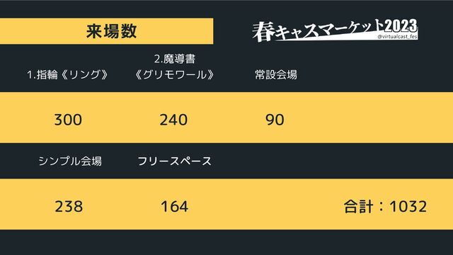 300 240 90 合計:1032 来場数 1.指輪《リング》 2.魔導書 《グリモワール》 常設会場 238